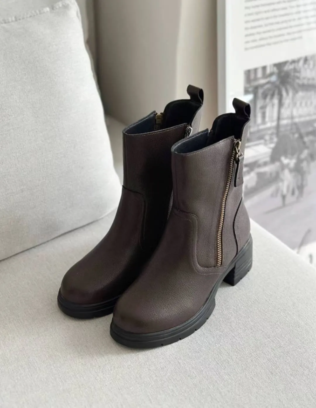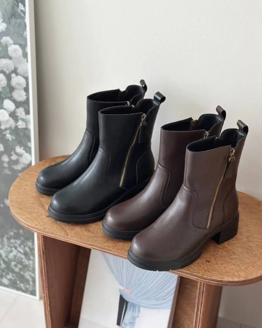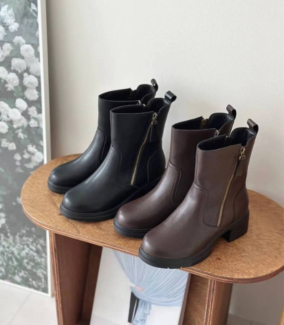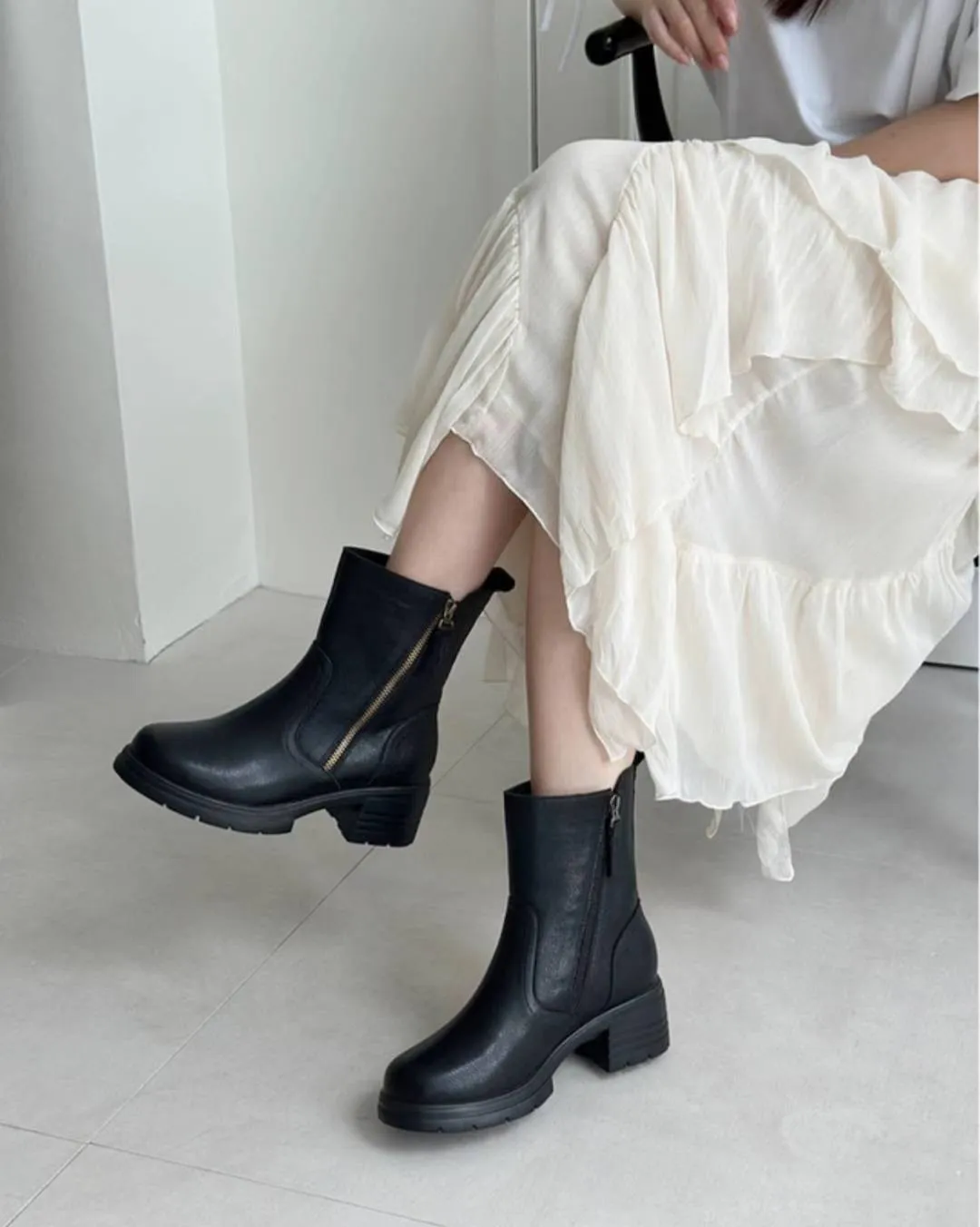 韓國 真皮雙斜拉鏈造型寬口短靴-跟高5cm