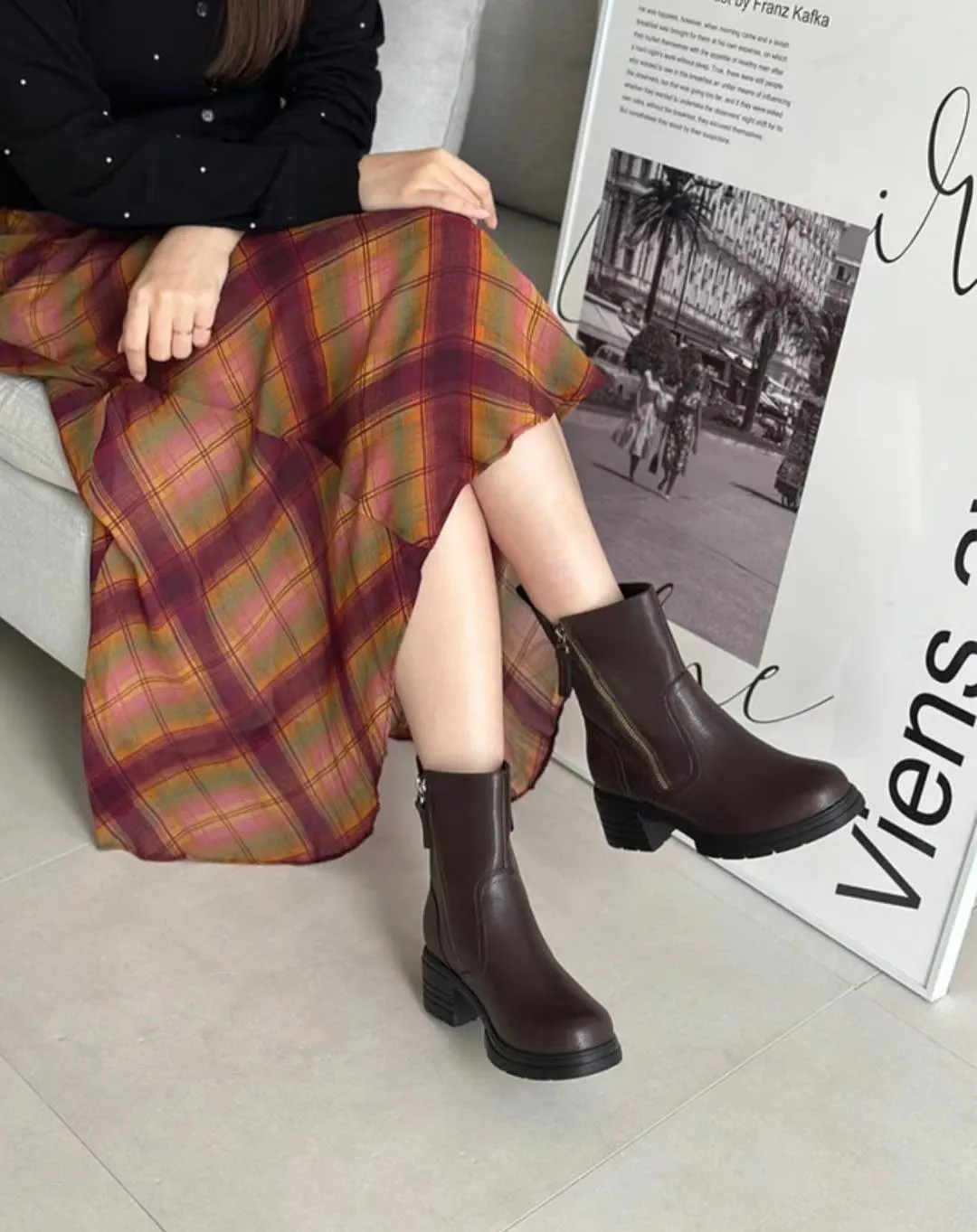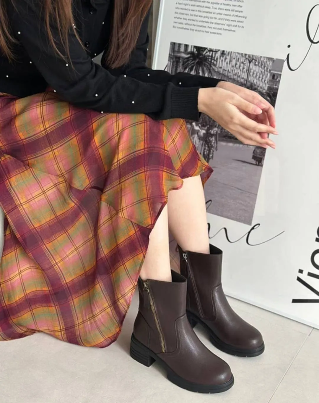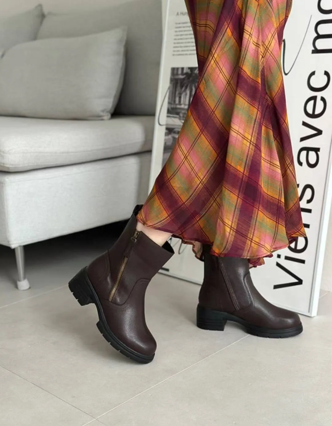 韓國 真皮雙斜拉鏈造型寬口短靴-跟高5cm