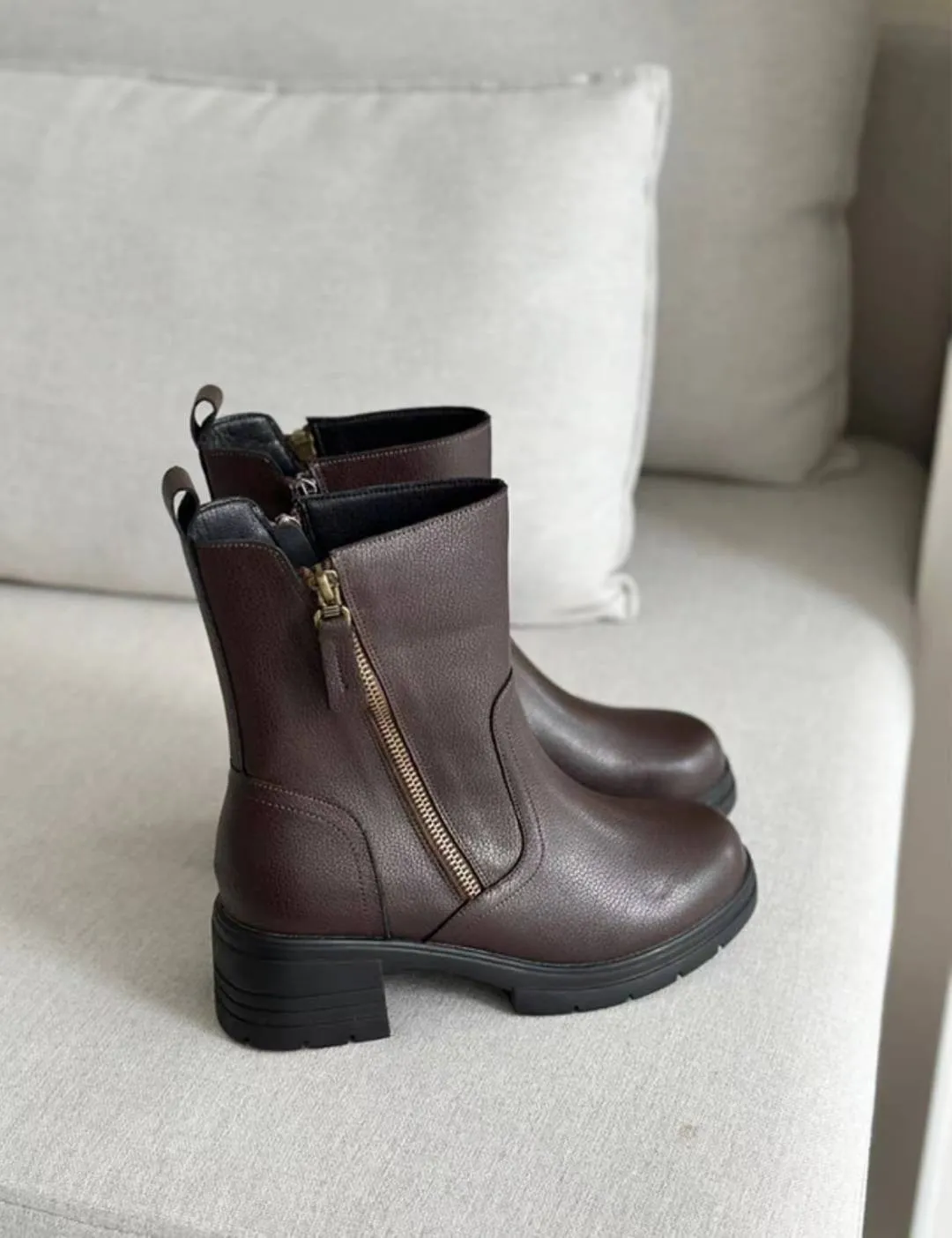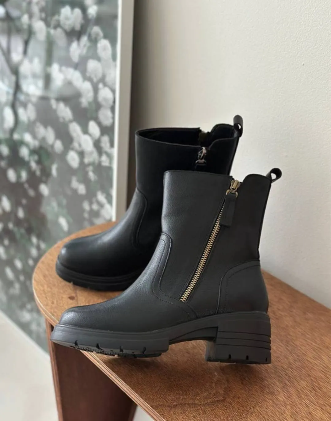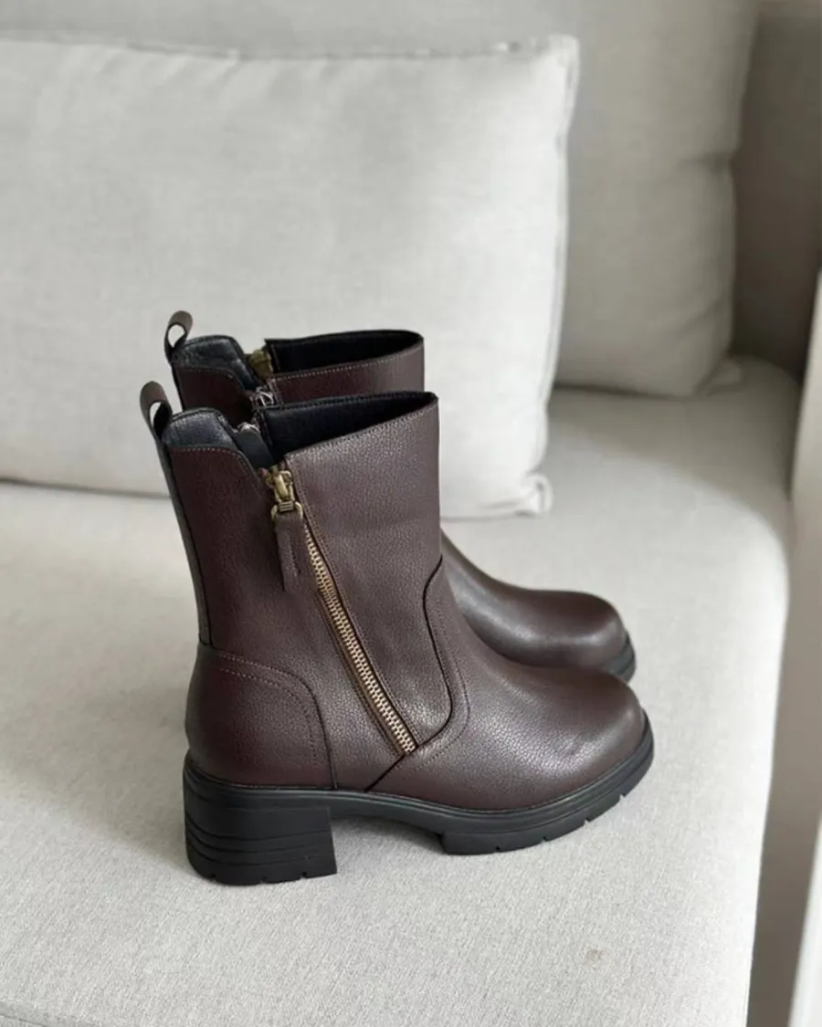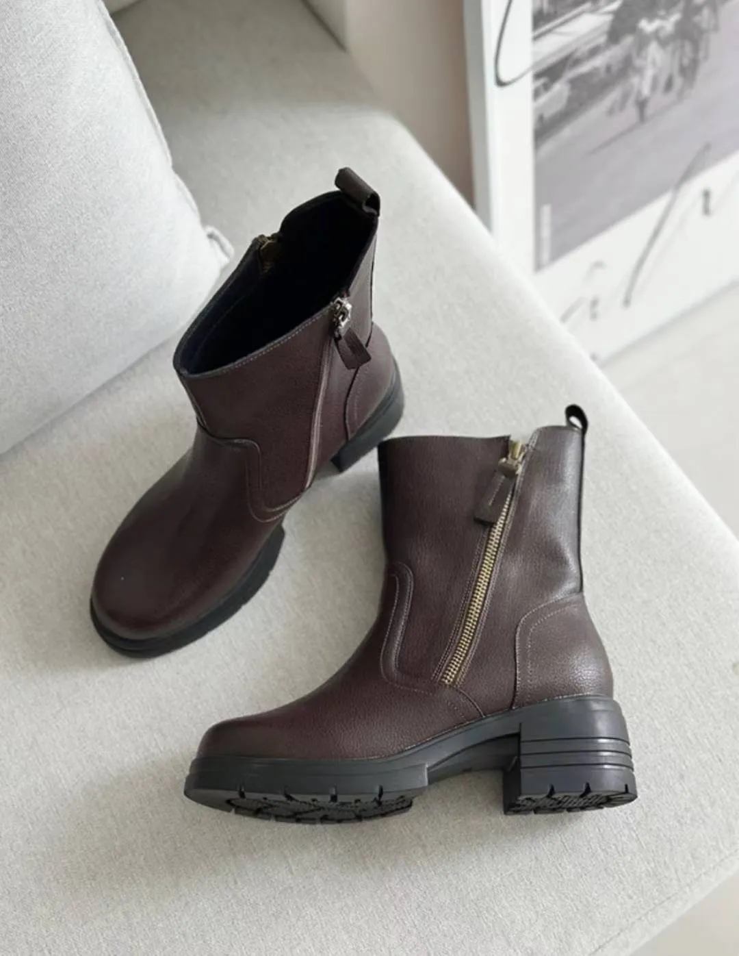 韓國 真皮雙斜拉鏈造型寬口短靴-跟高5cm