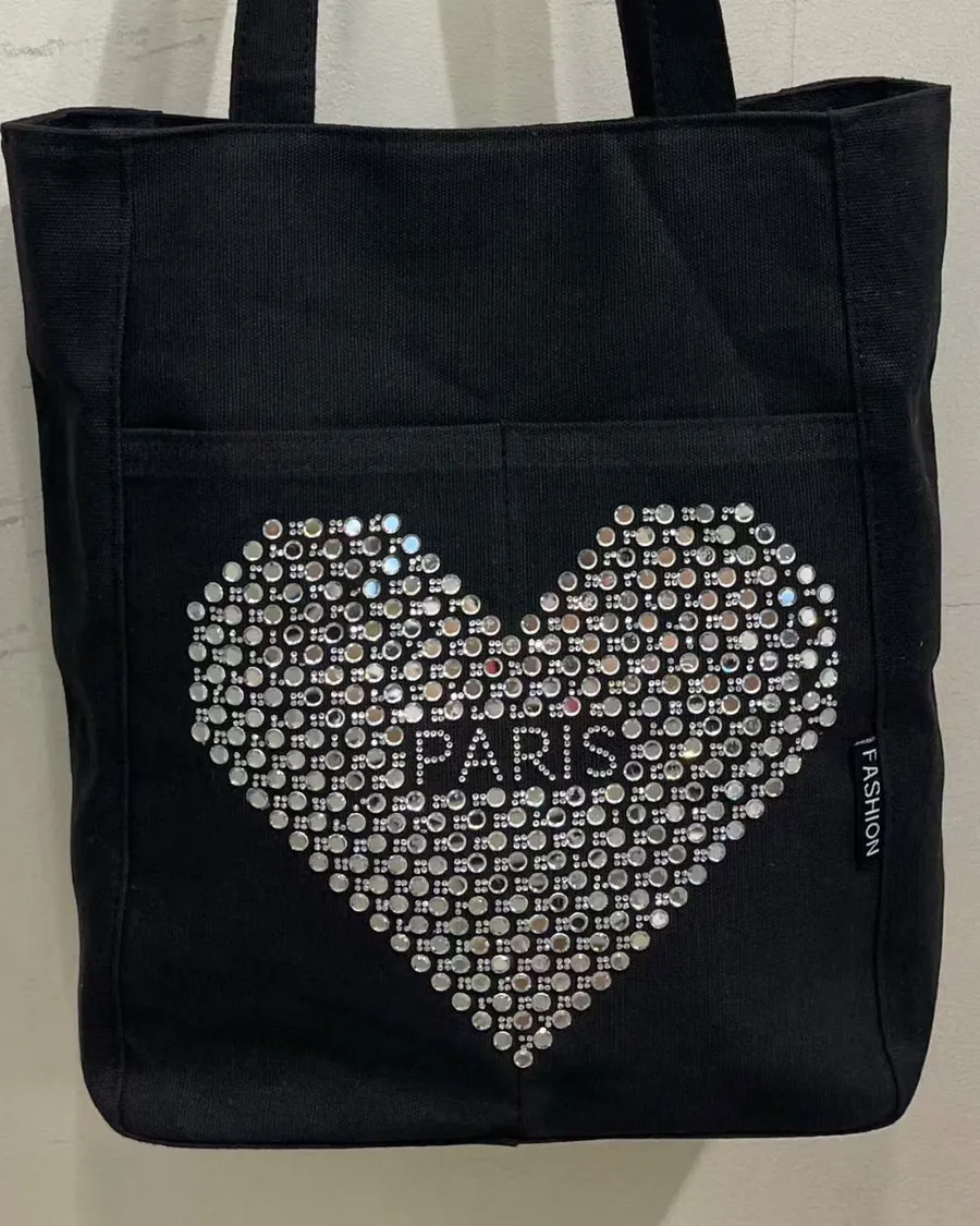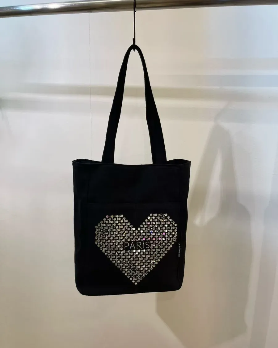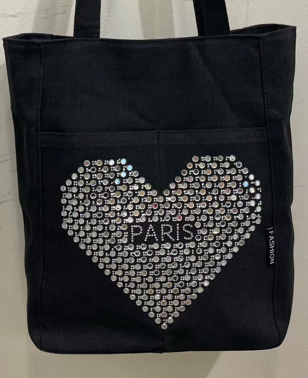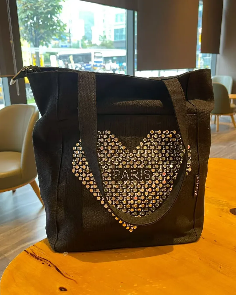 正韓 愛心亮鑽PARIS時尚肩背帆布包
