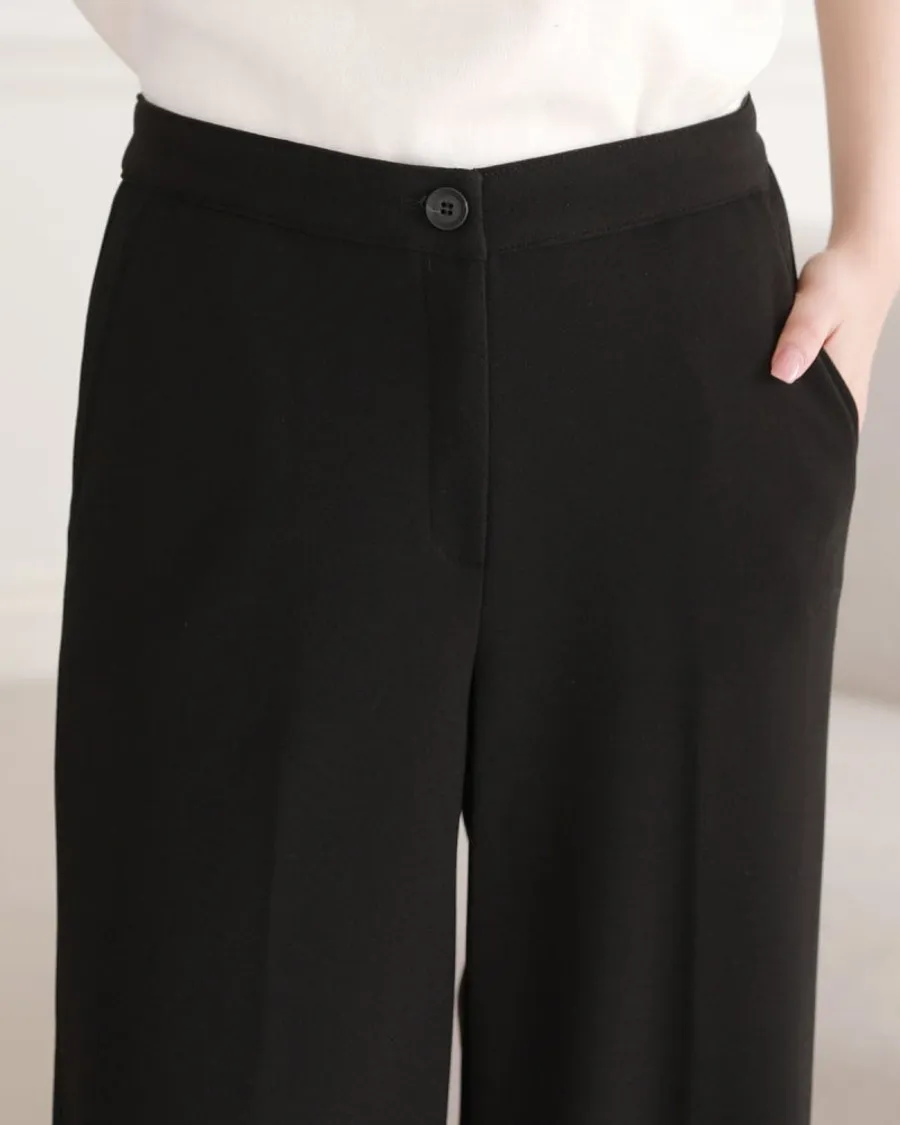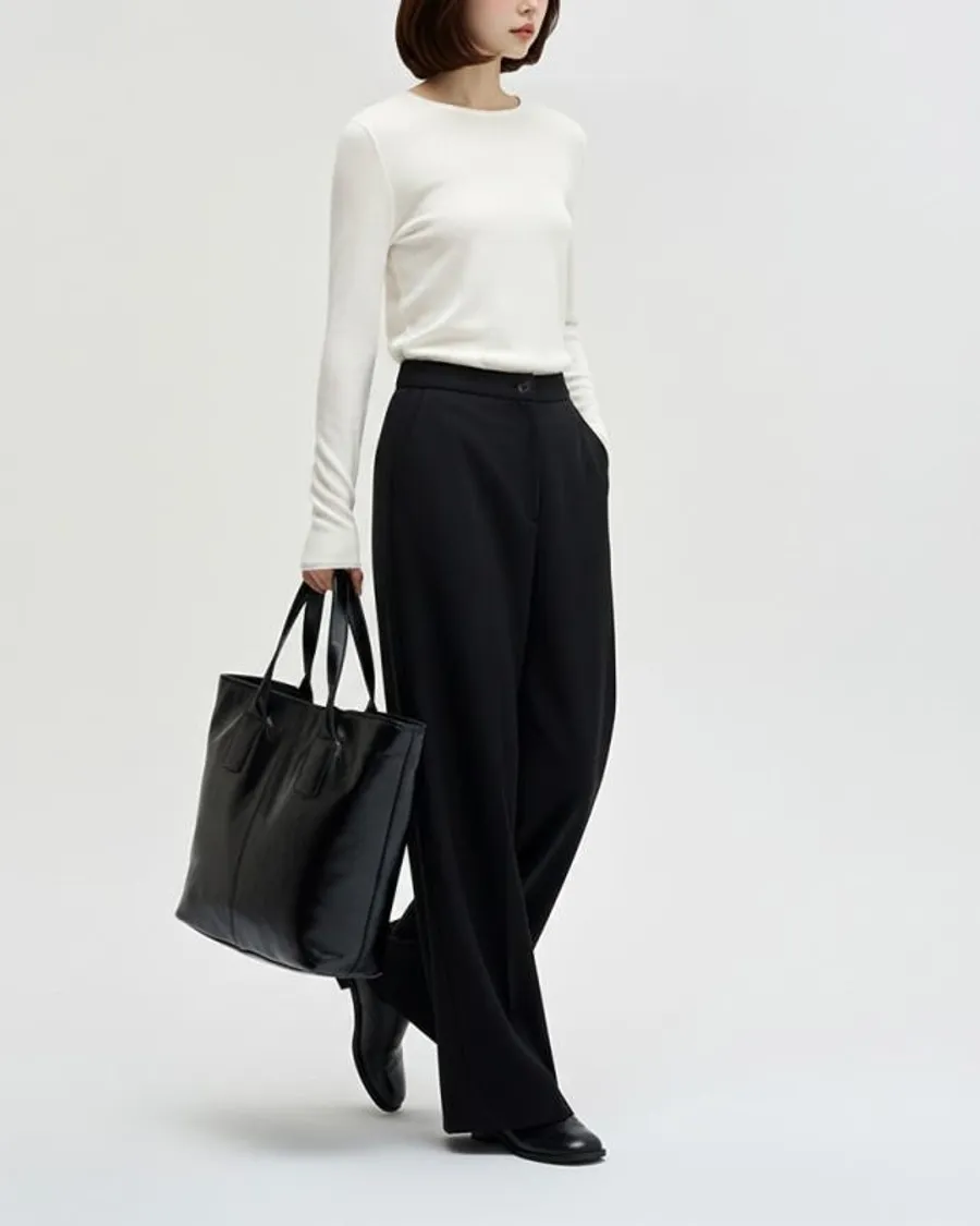 -從大腿到腳口順著延伸的長寬褲版型,修飾下半身比例