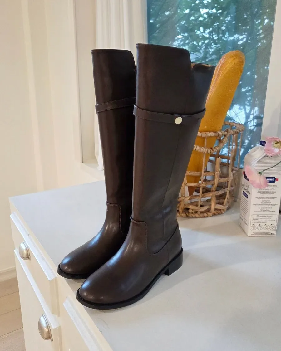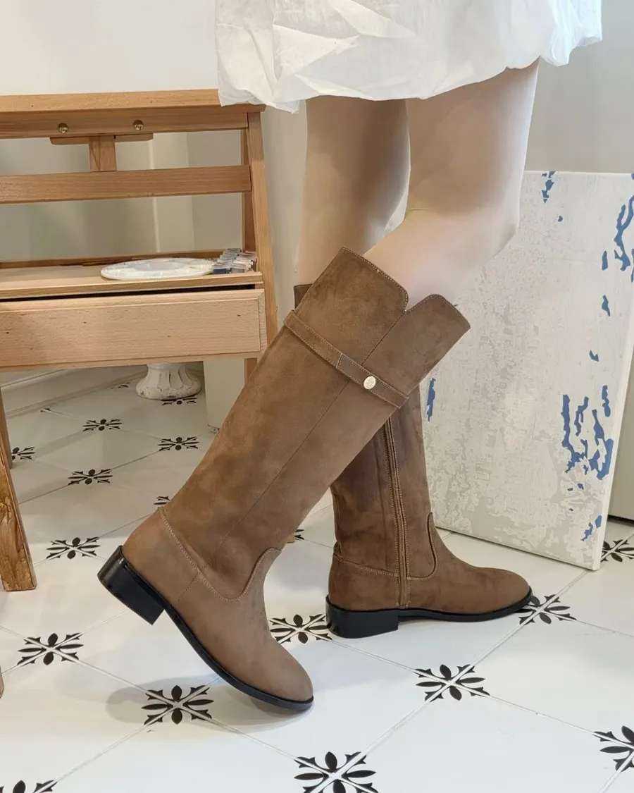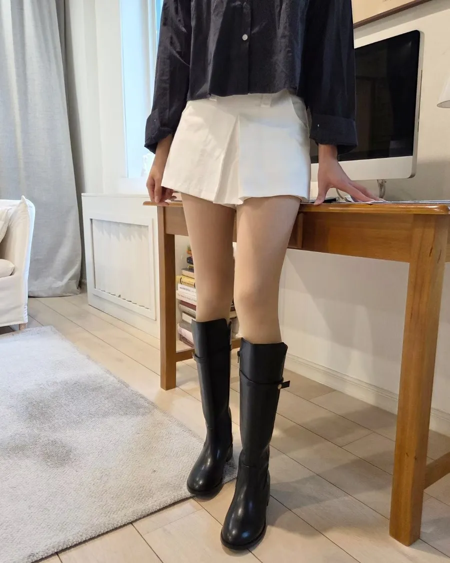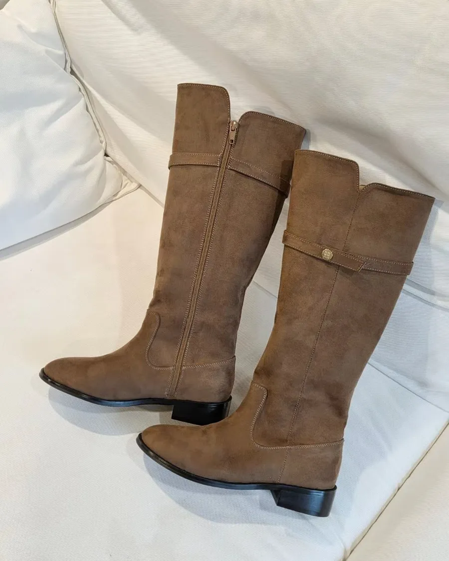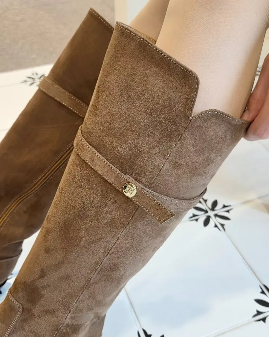 韓國 小圓釦簡約風V開口長筒靴-跟高3cm
