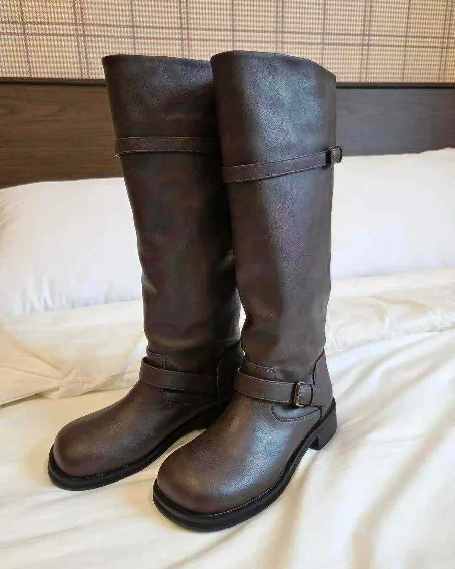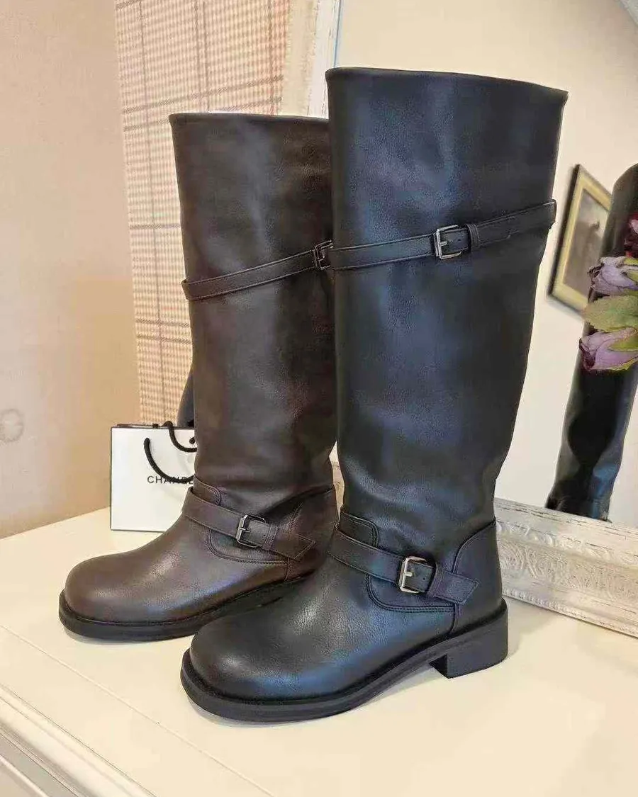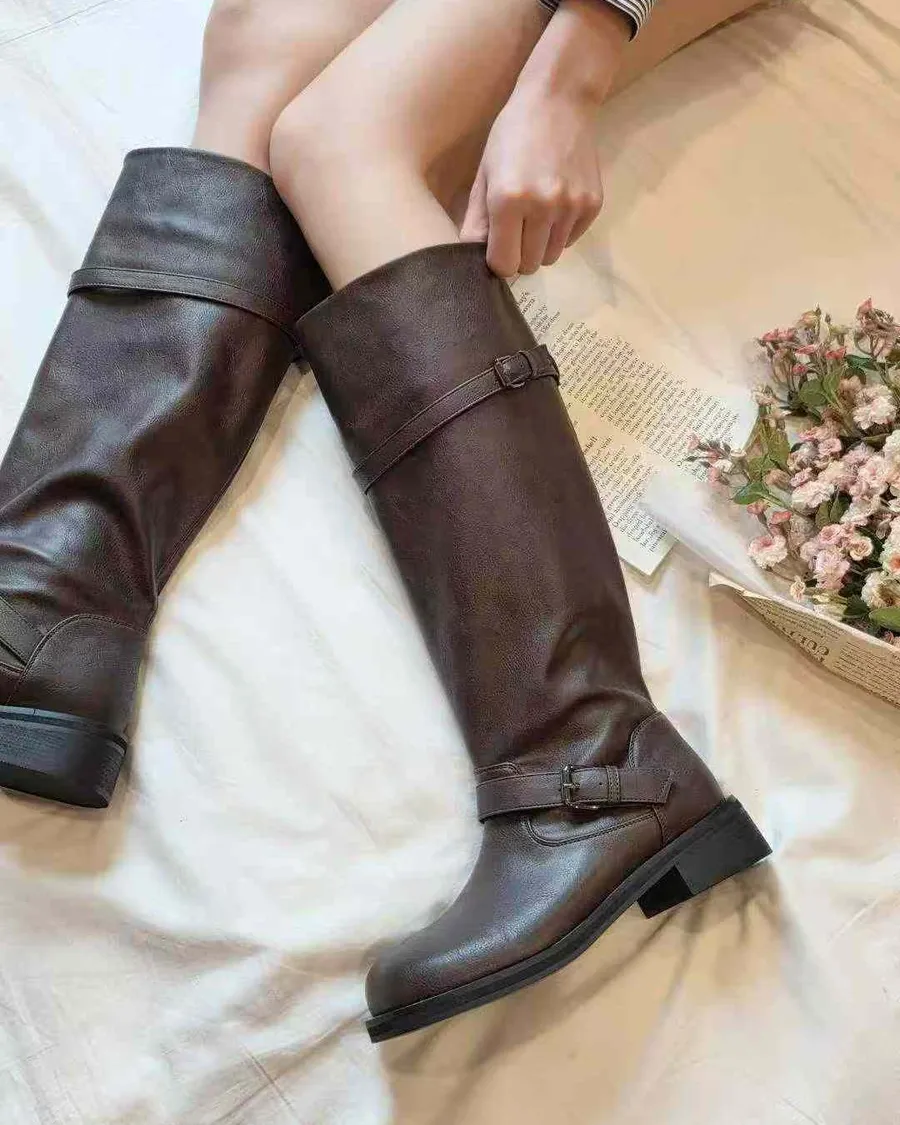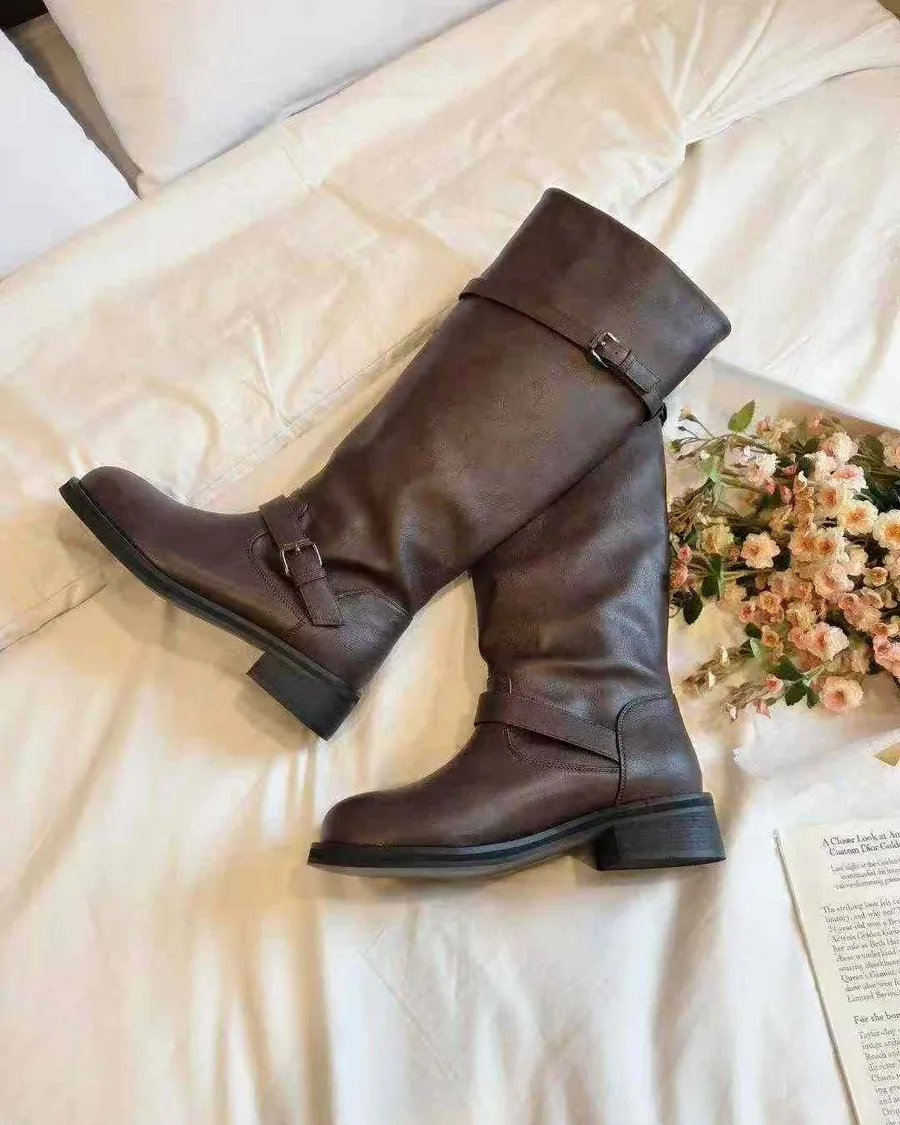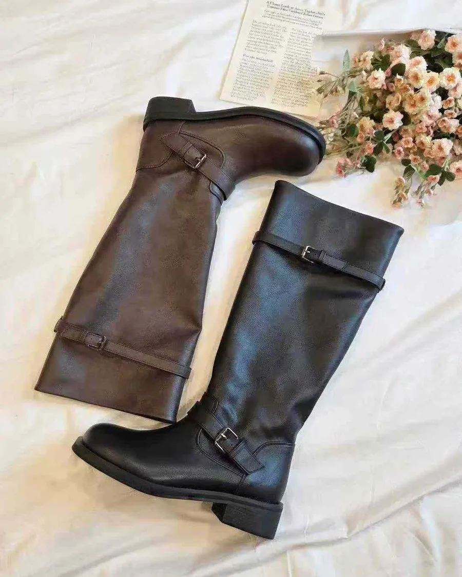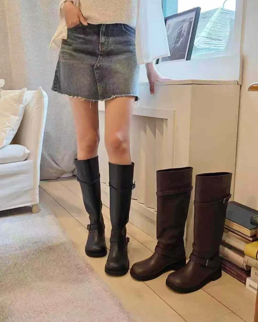 韓國 寬頭雙斜釦環造型長筒靴-跟高4cm