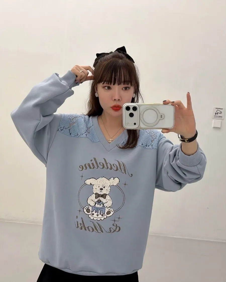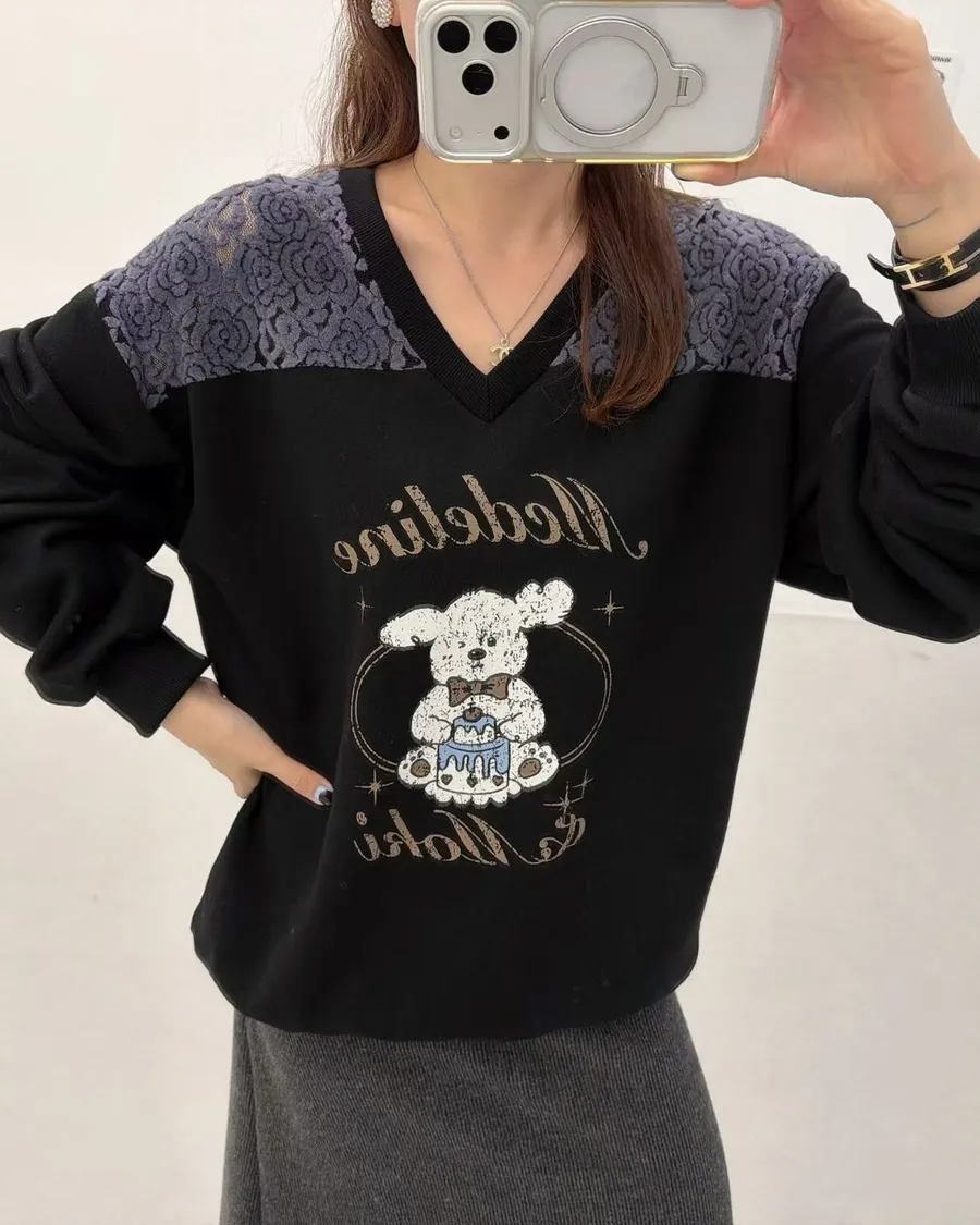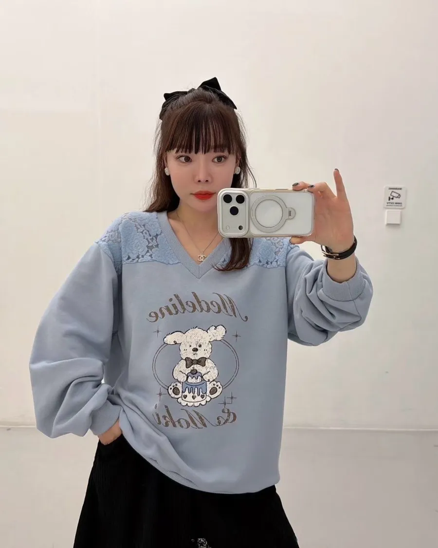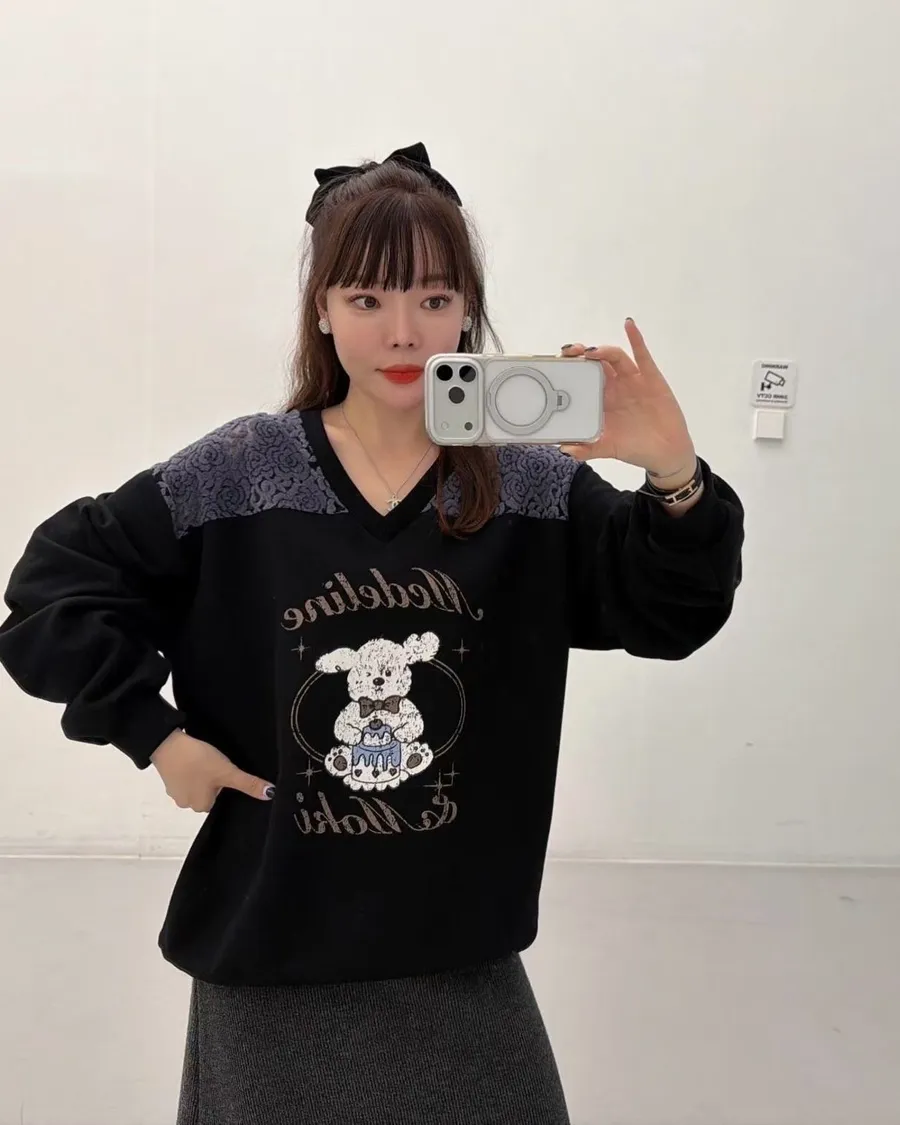 正韓 翹耳狗V領肩壓花舒適棉質上衣