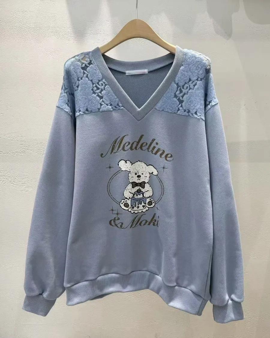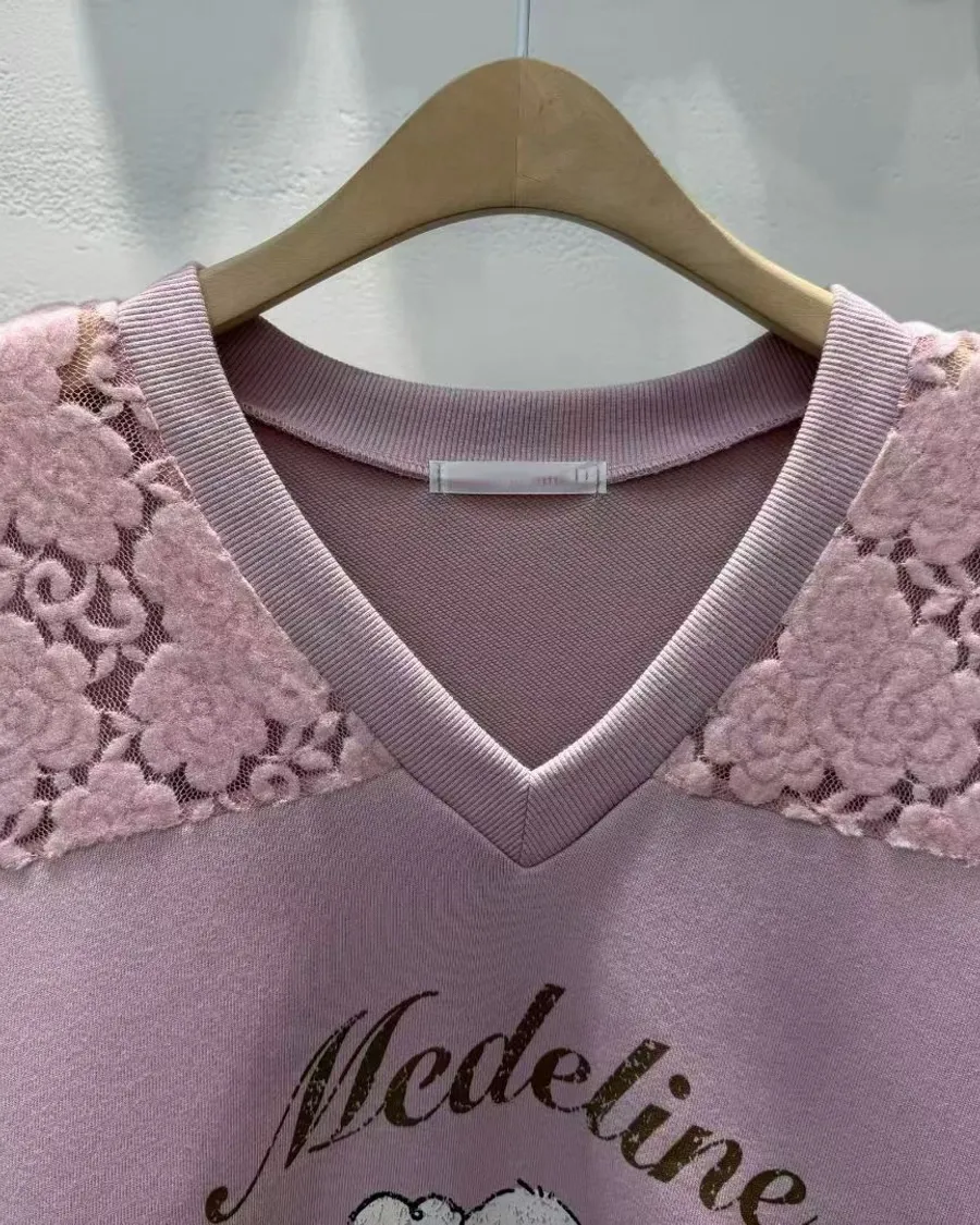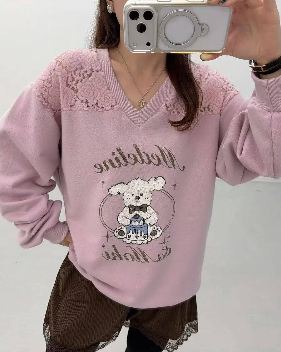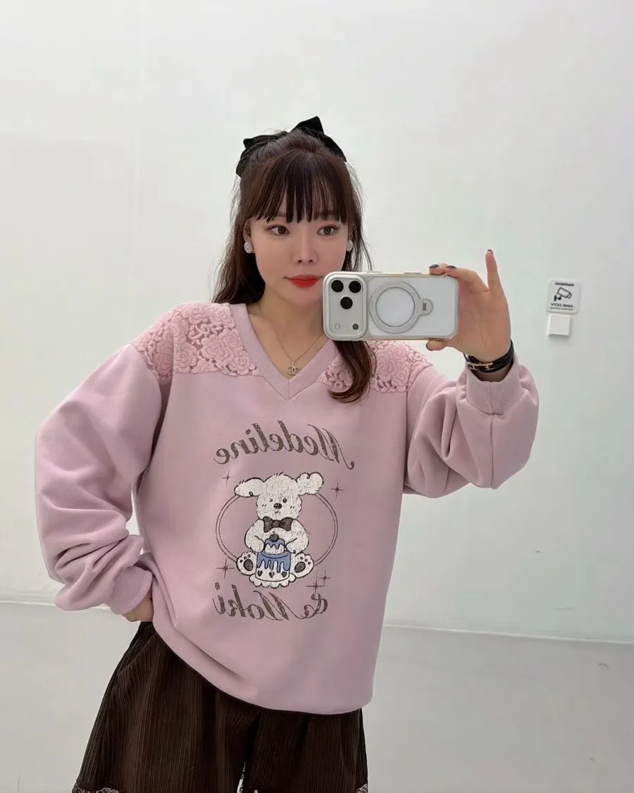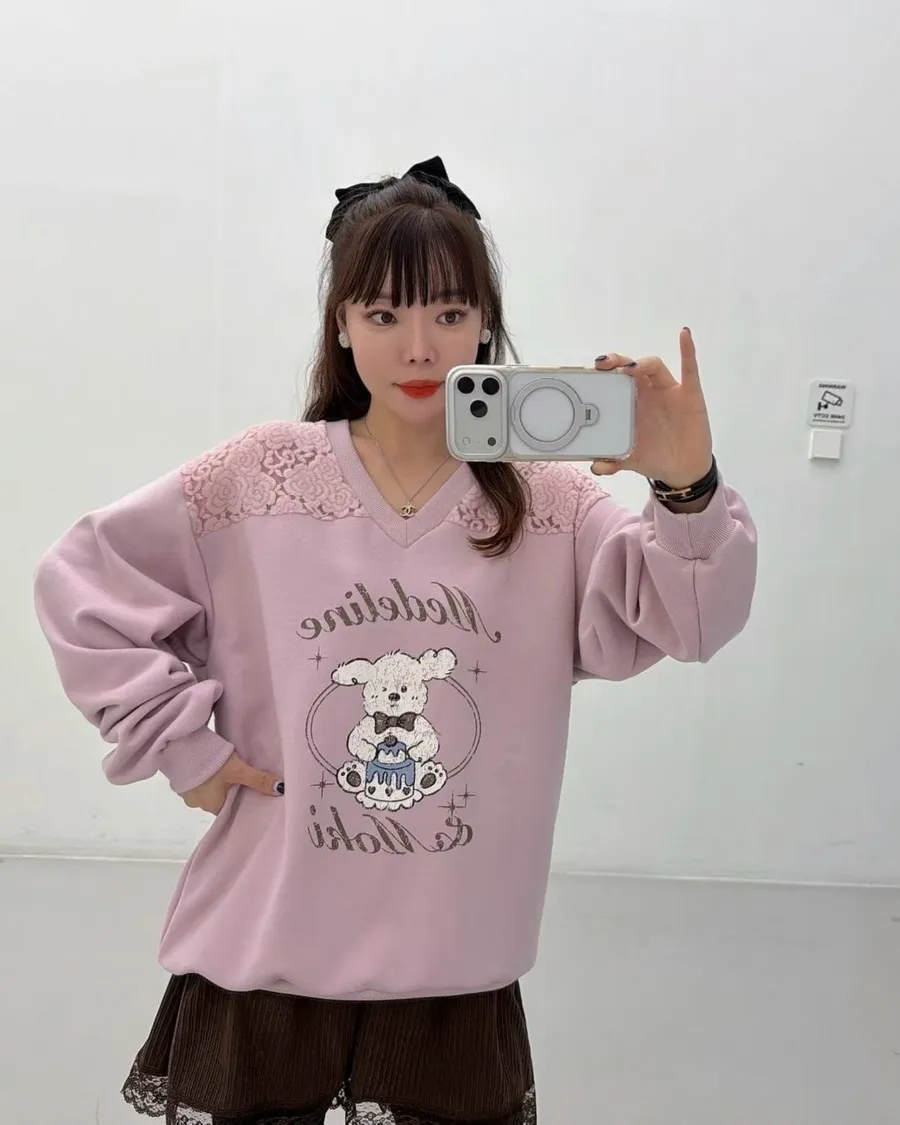 正韓 翹耳狗V領肩壓花舒適棉質上衣