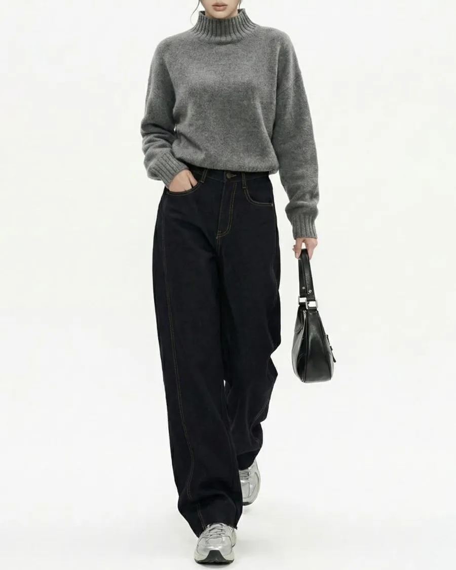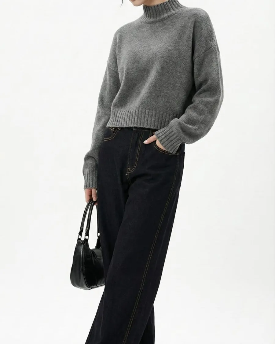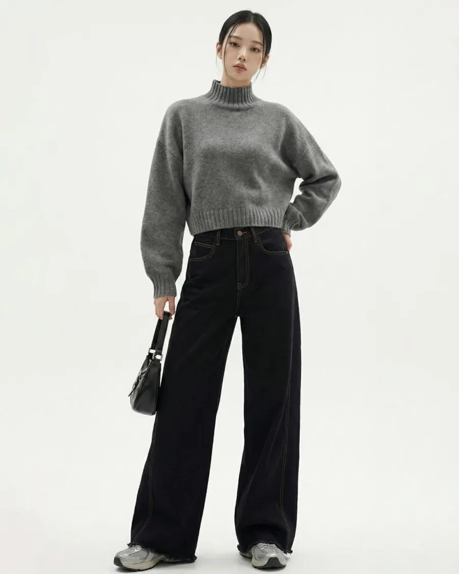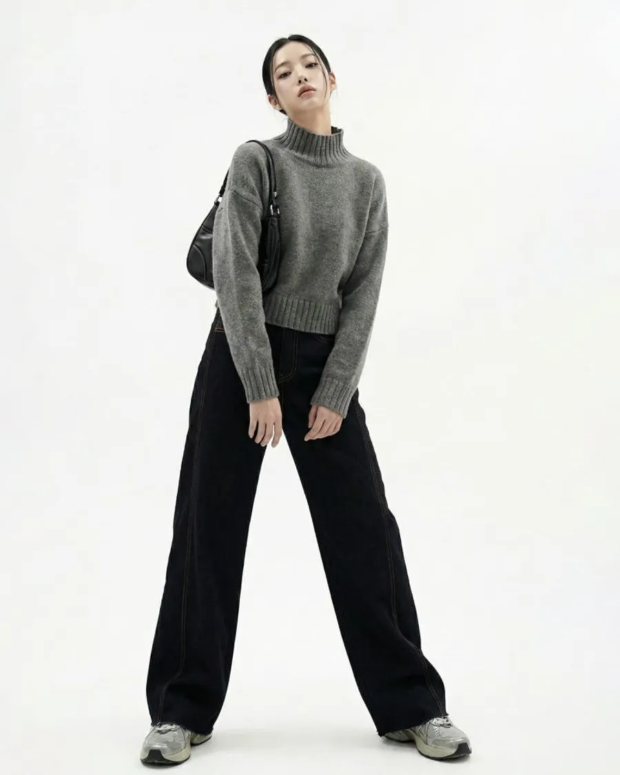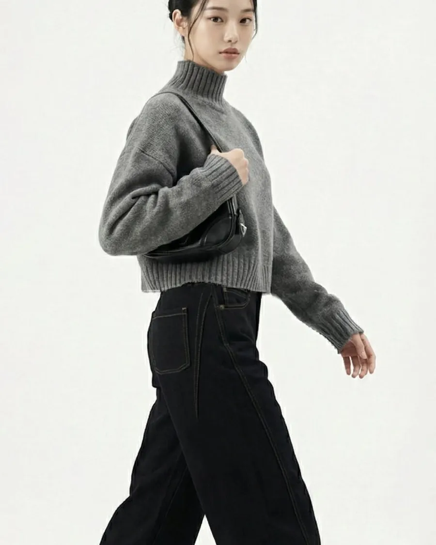 • 灰色半領針織→冬季風格,突顯材質對比,捕捉街頭感