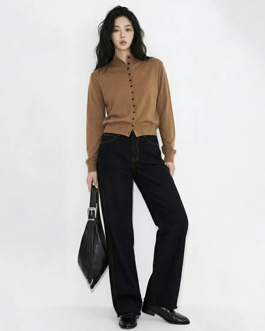 • 棕色極簡開襟衫 →溫暖的棕色與深黑色形成對比,營造出寧靜的現代經典氛圍