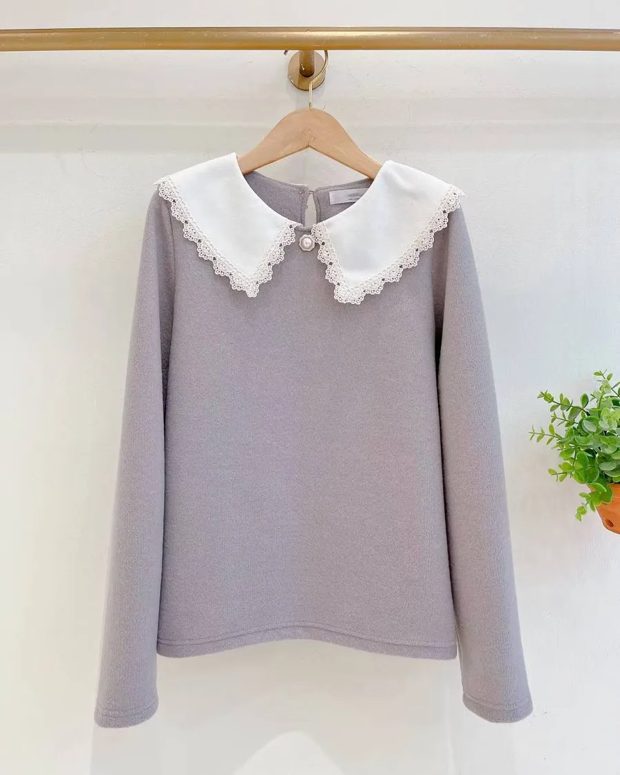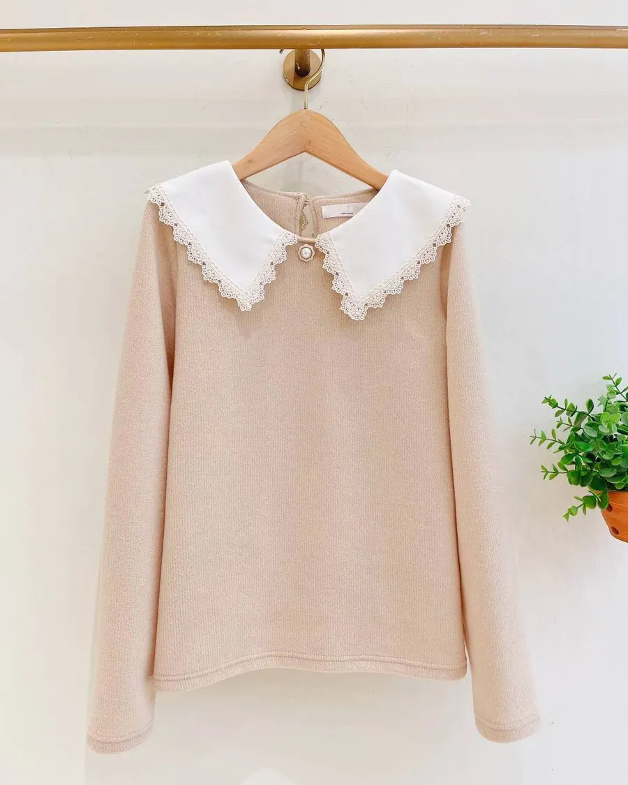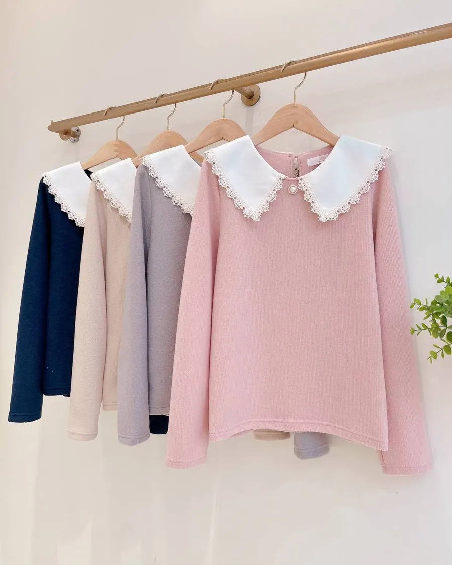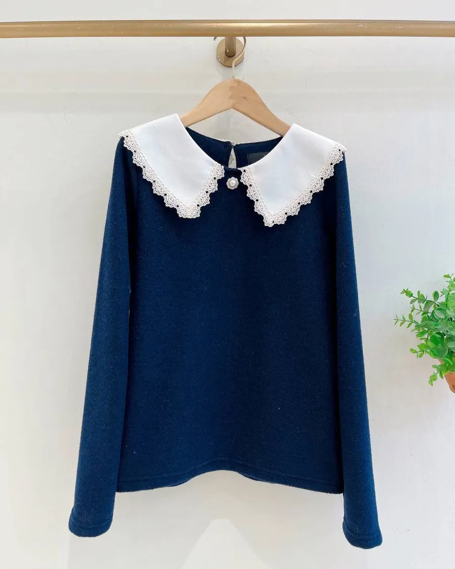 正韓 滾花邊領配色棉感上衣
