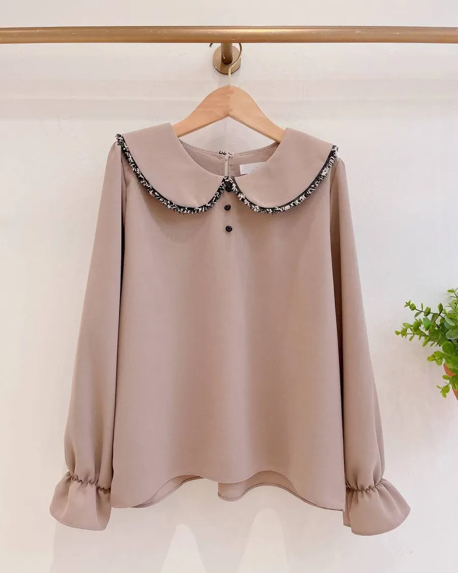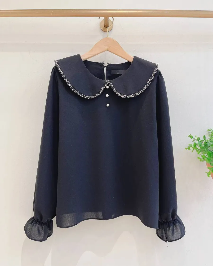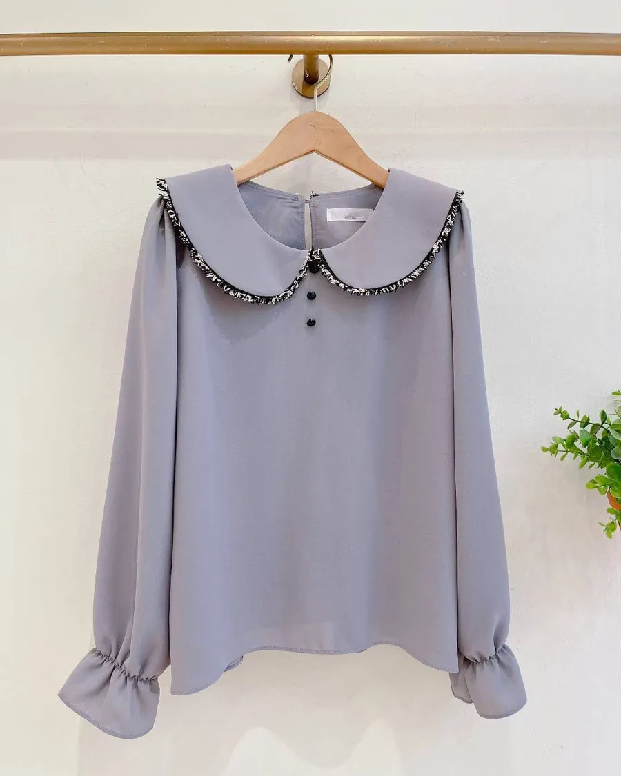 正韓 混色滾毛邊領厚雪紡上衣