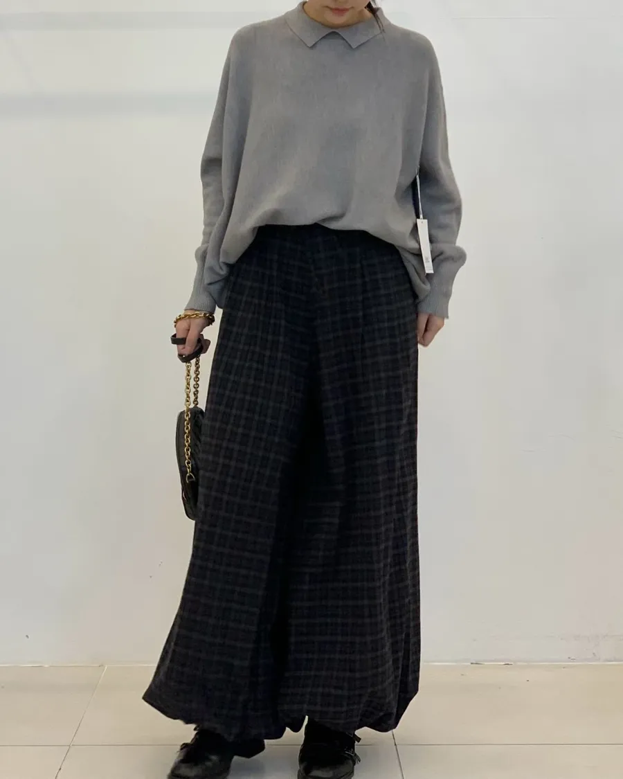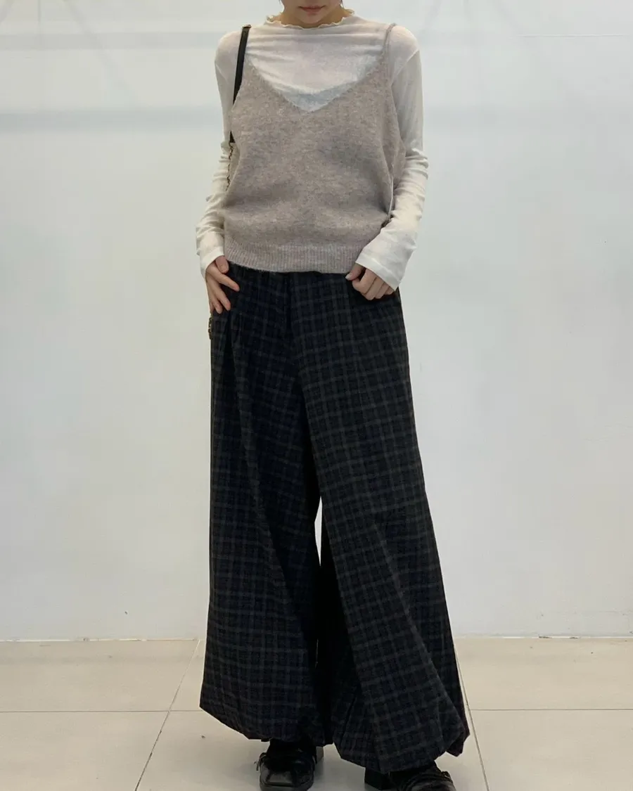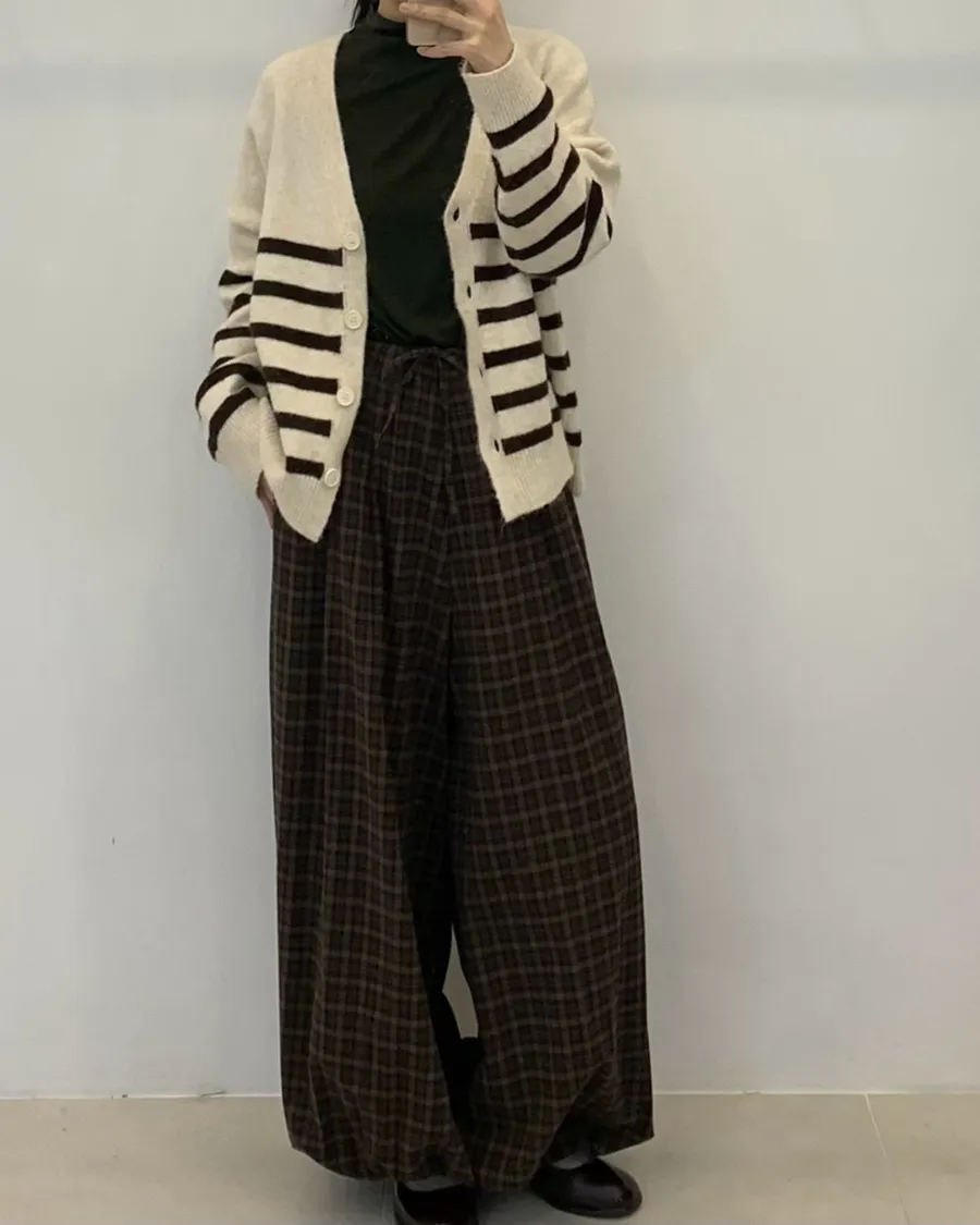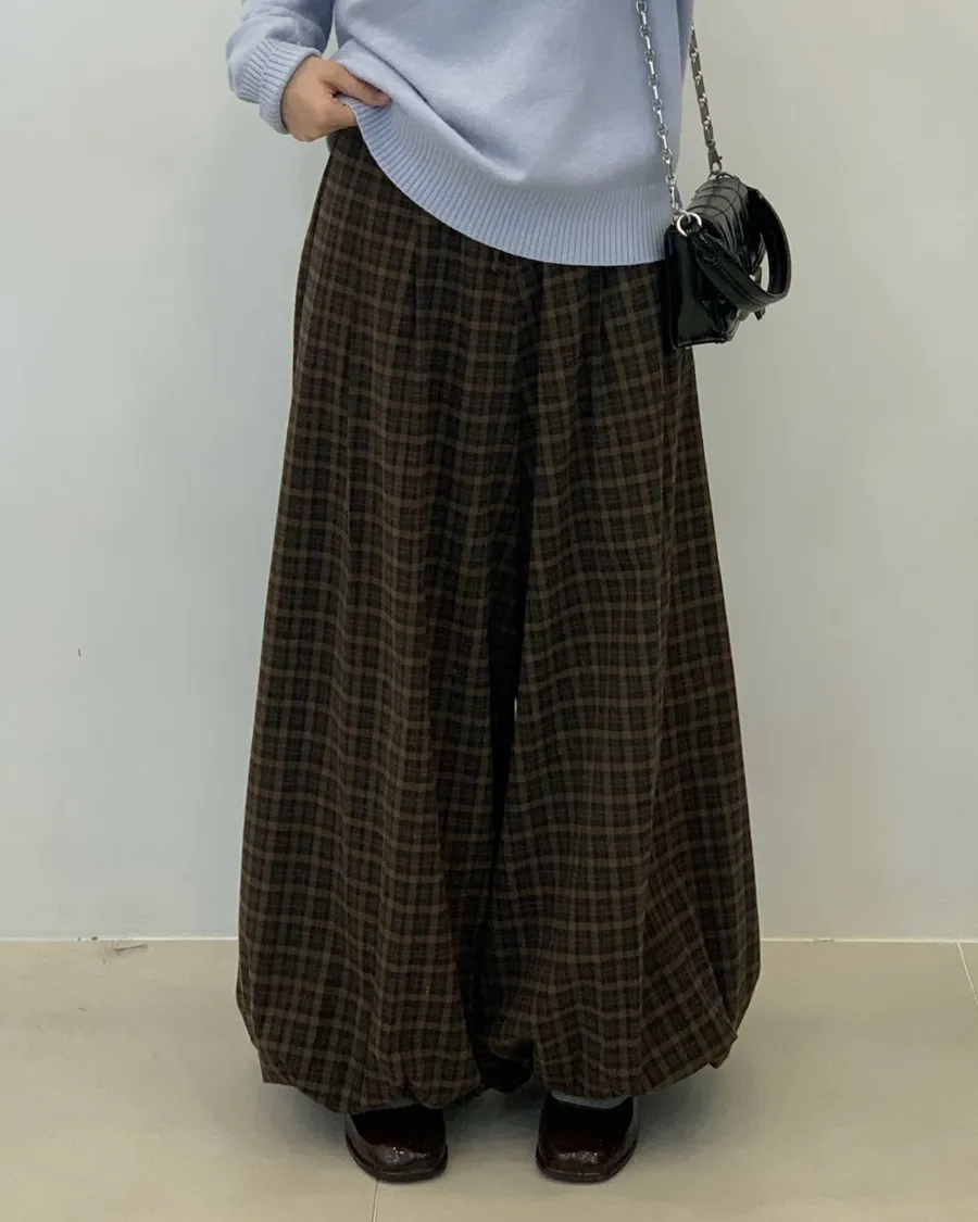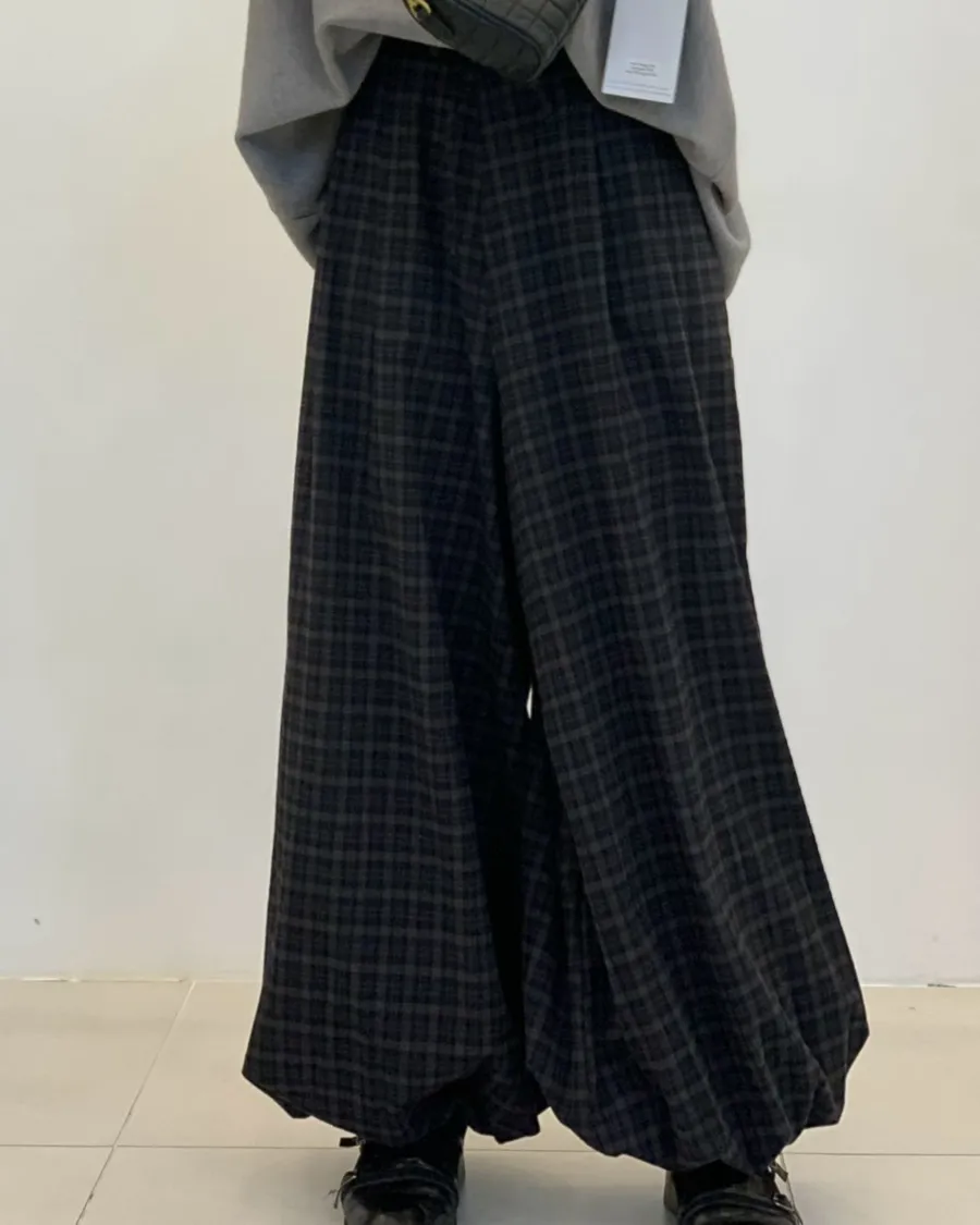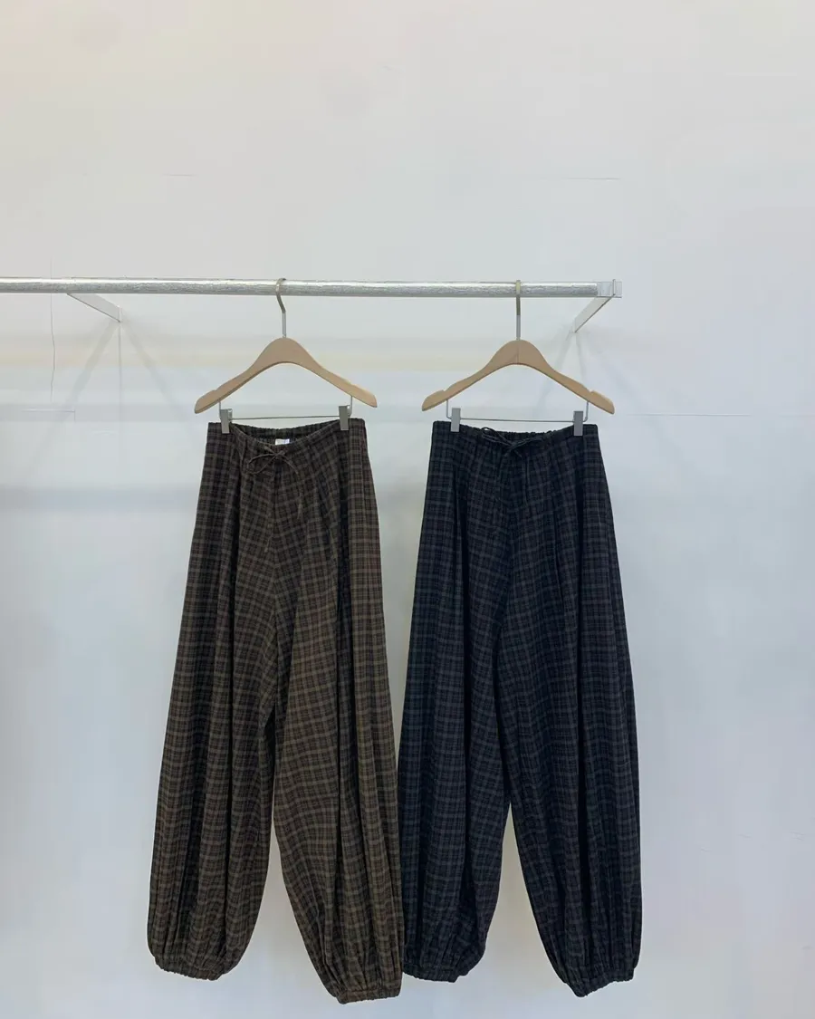 韓製格紋鬆緊抽繩燈籠褲