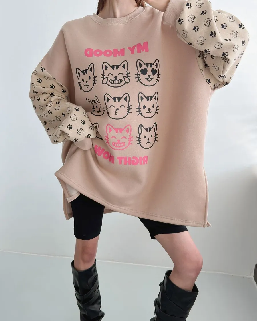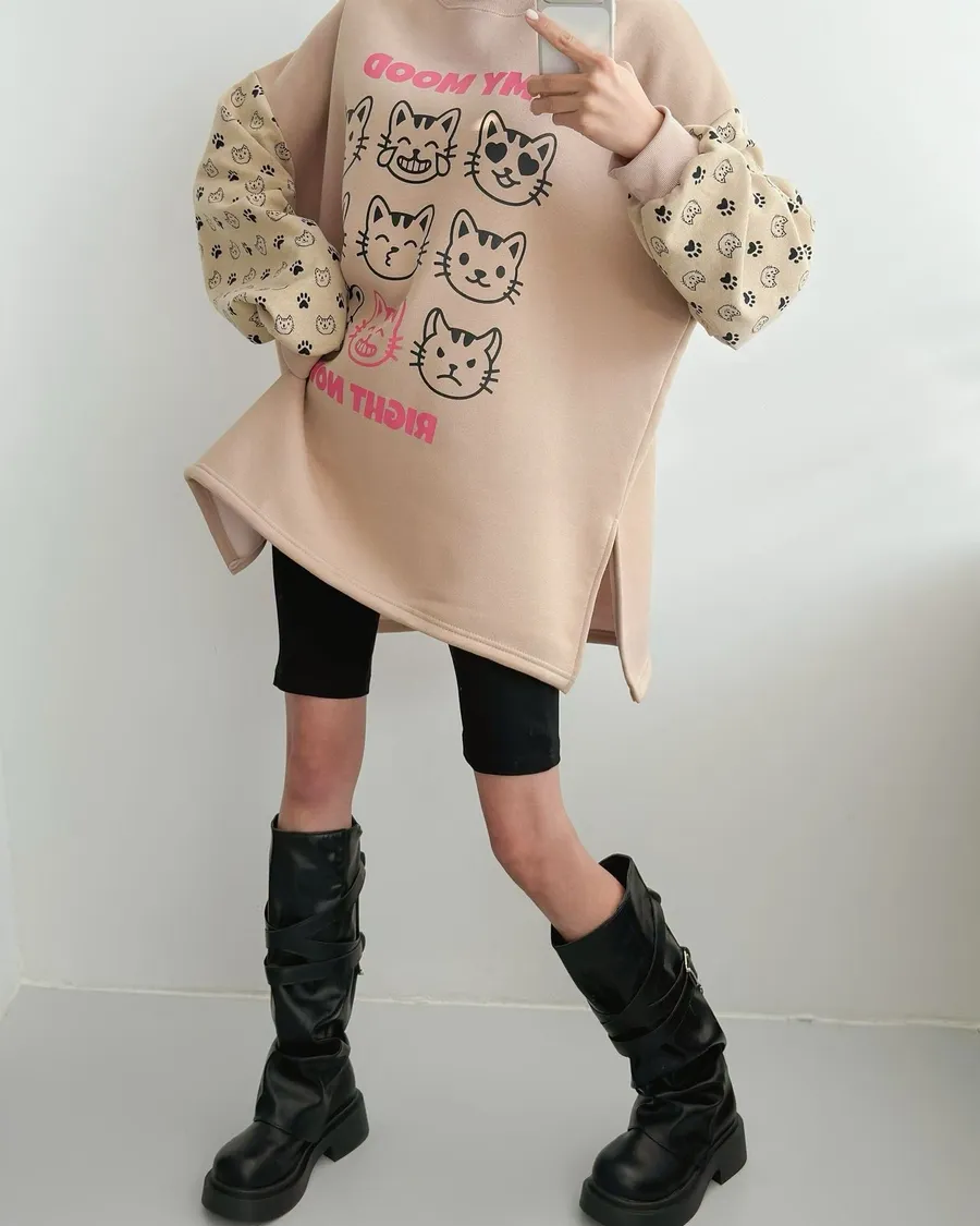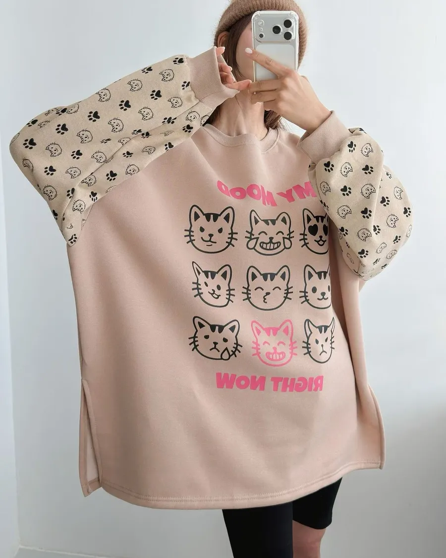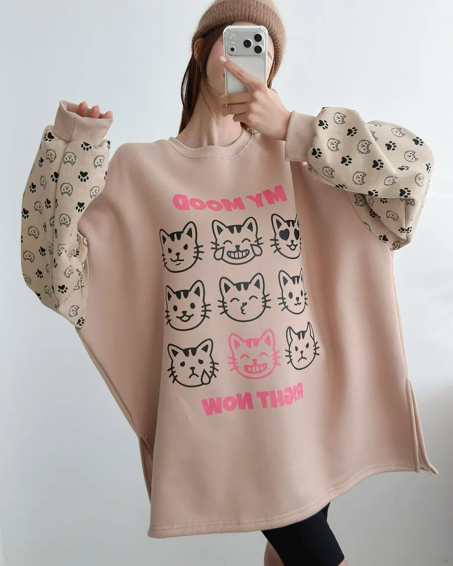 正韓 貓咪九宮格加絨長版上衣