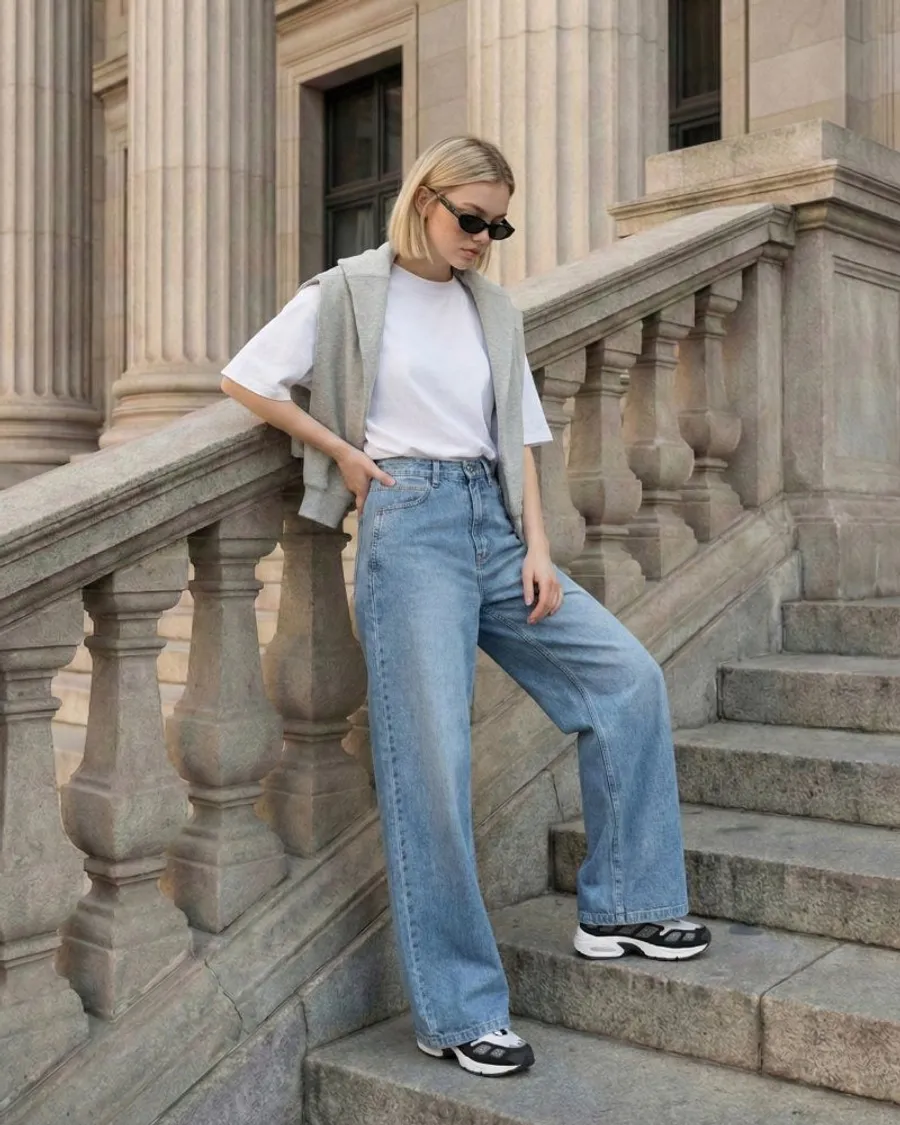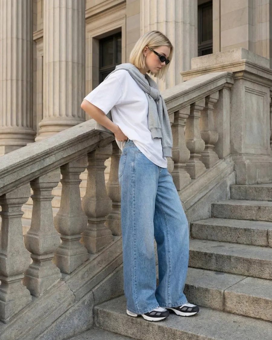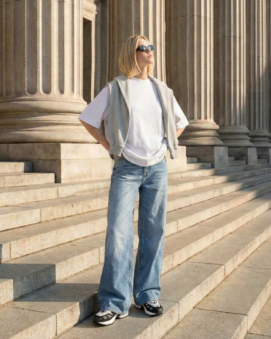 • 一個萬無一失的白色T卹搭配:用一件乾淨的白色襯衫來突出獨特的側縫細節。