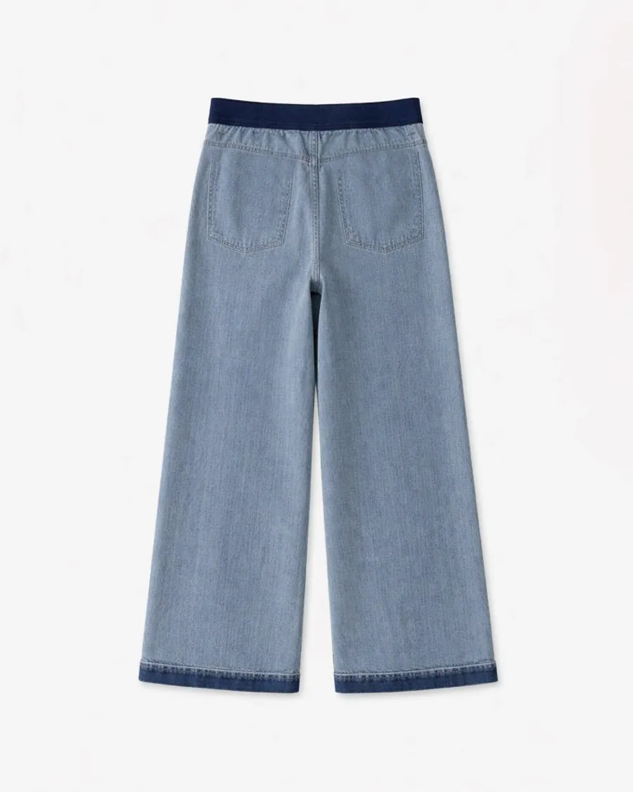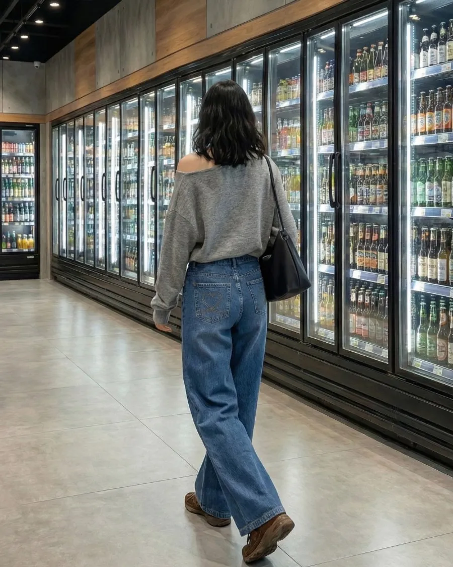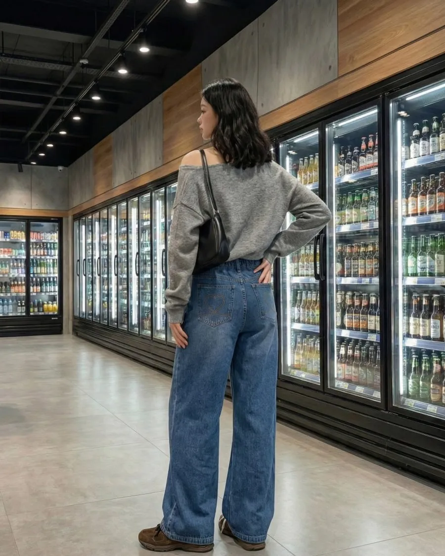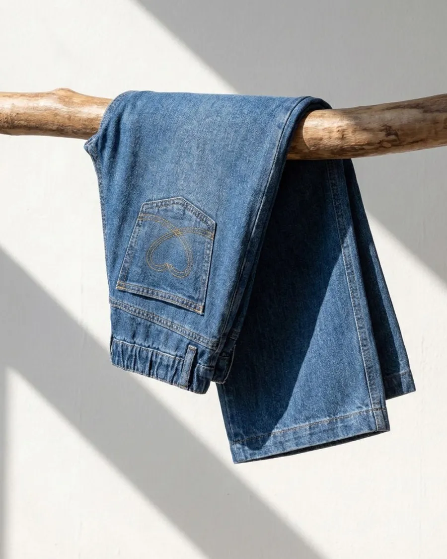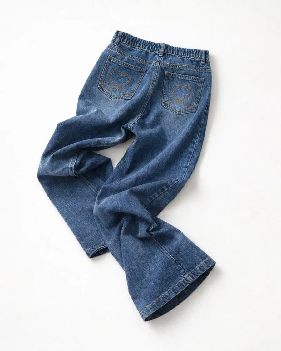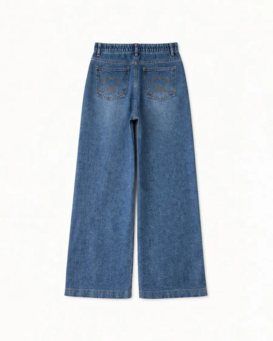 鬆緊腰頭設計,漂亮的背面心形刺繡牛仔寬褲