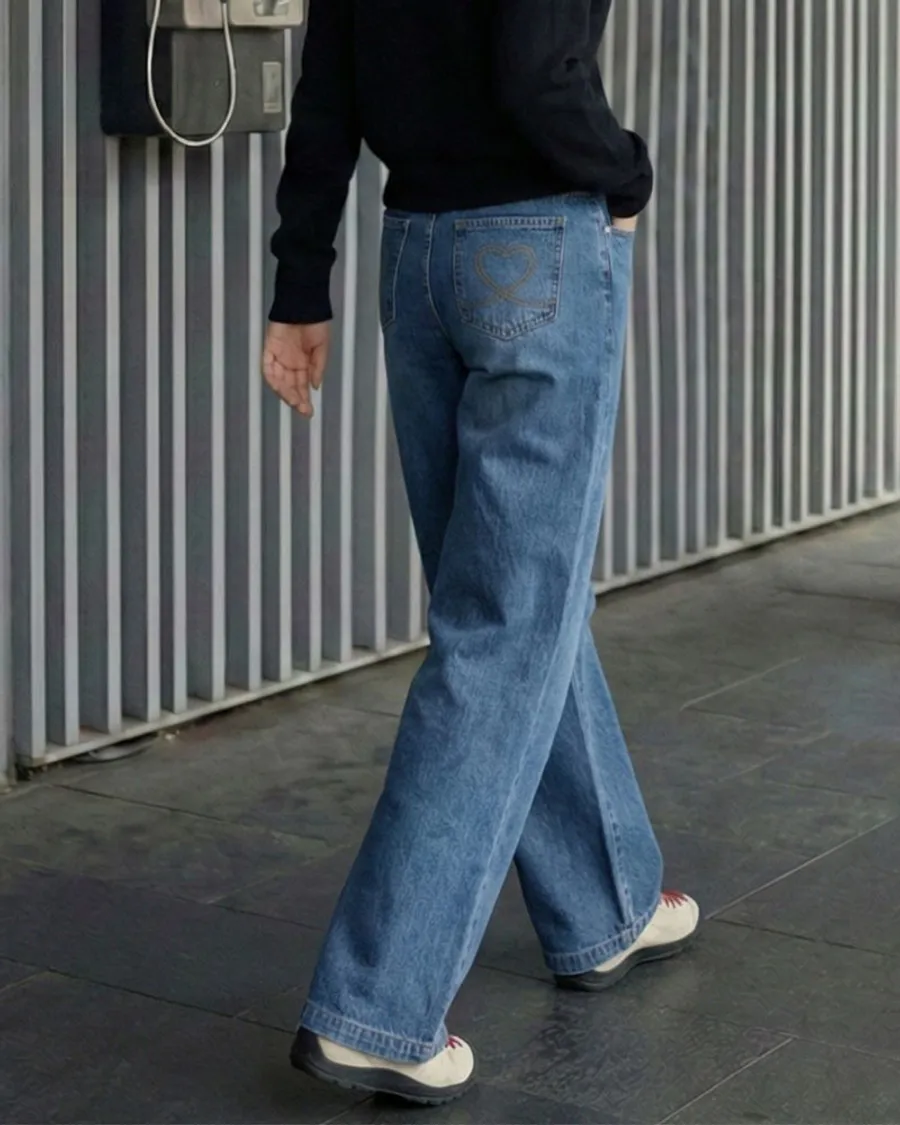 正韓 鬆緊腰頭心形刺繡口袋牛仔寬褲
