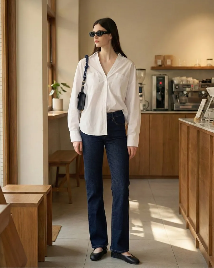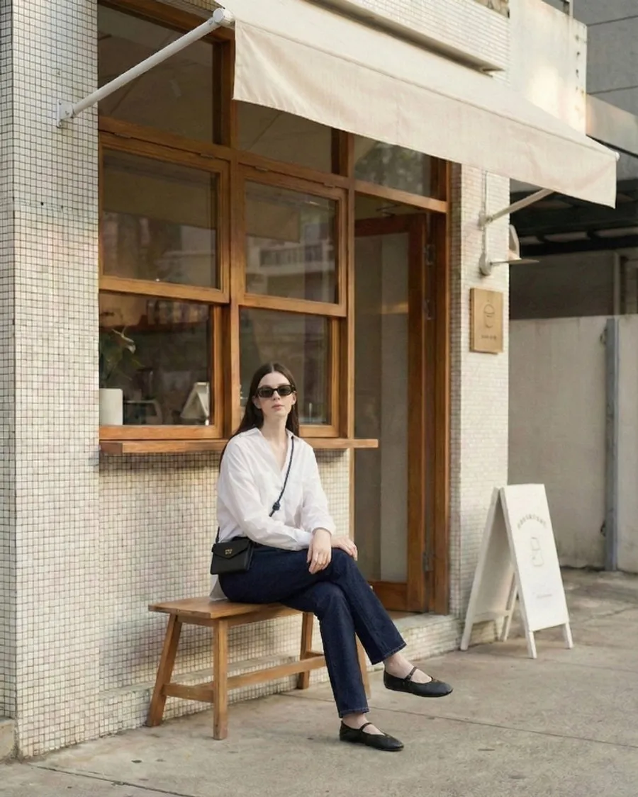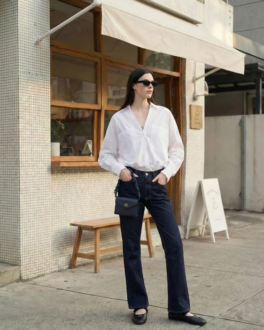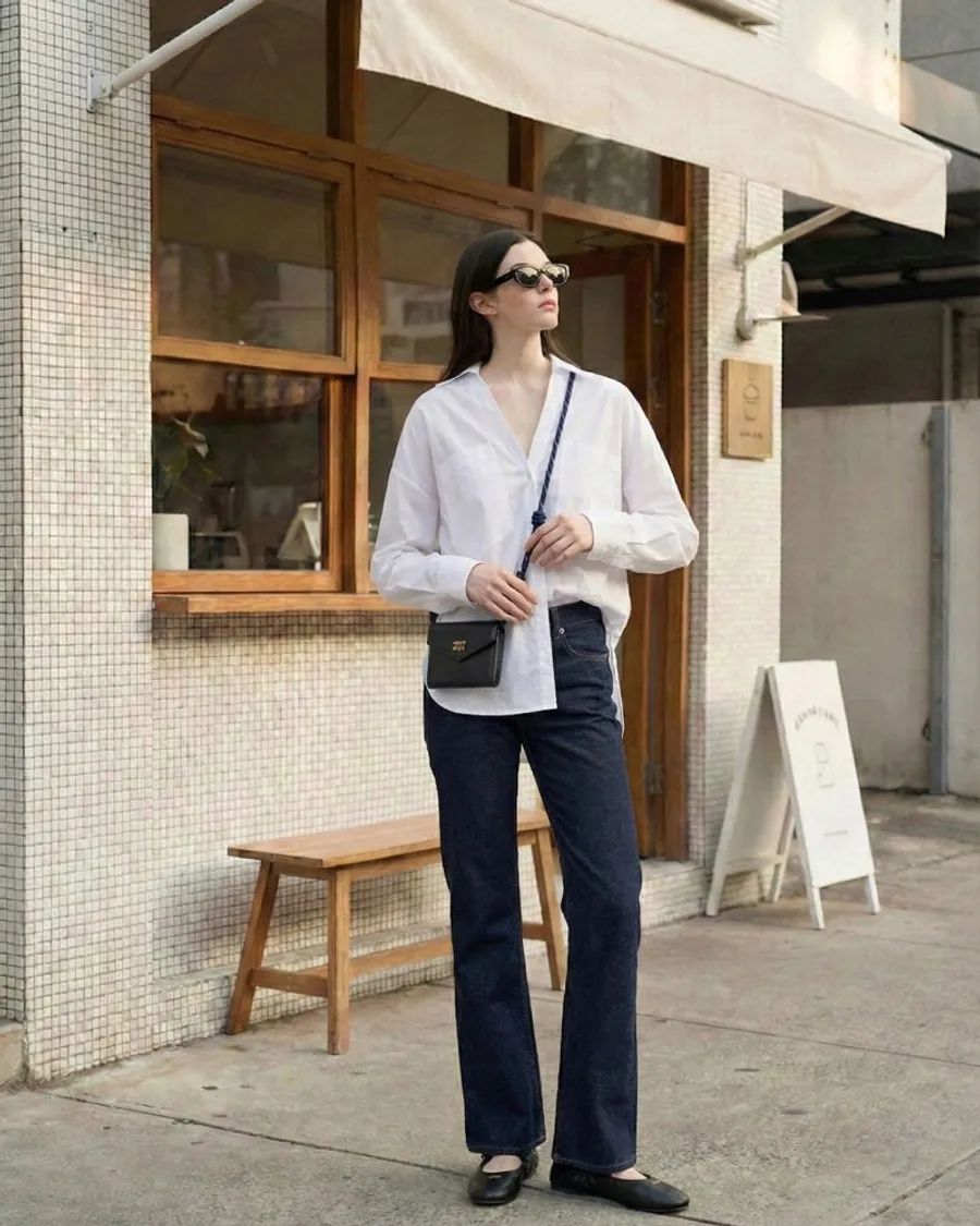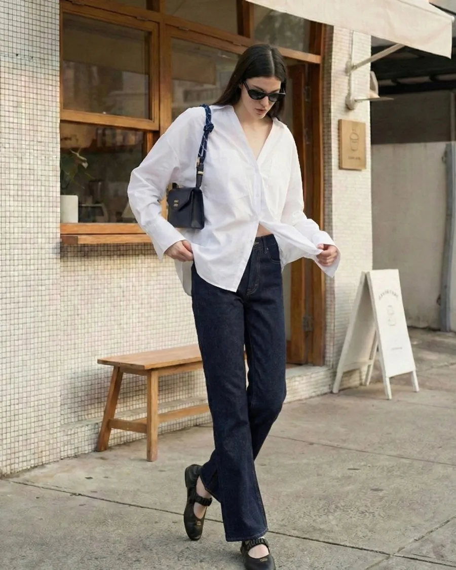 • 極簡造型:將白色襯衫塞進牛仔褲裡,以突顯原色牛仔褲的輪廓。
