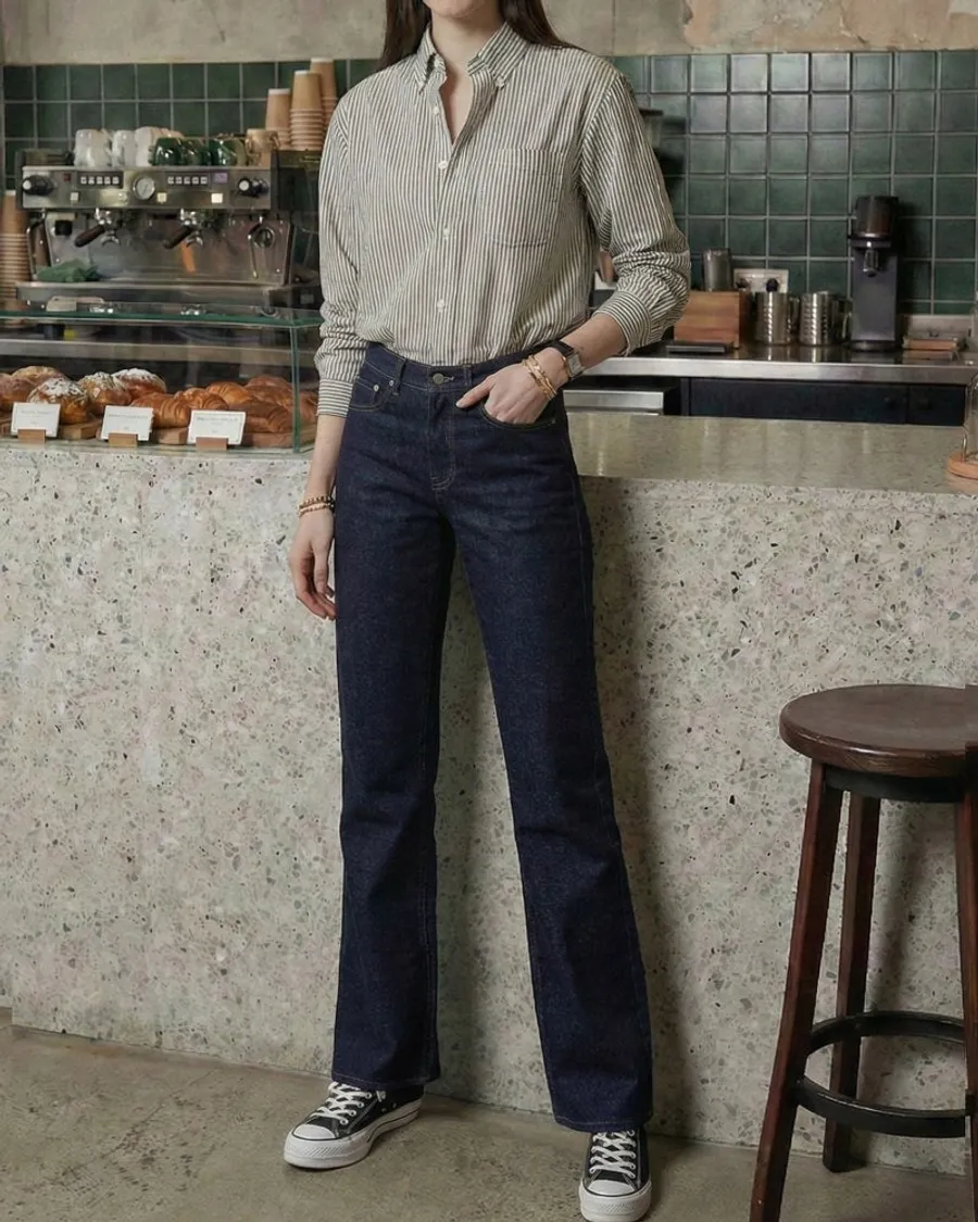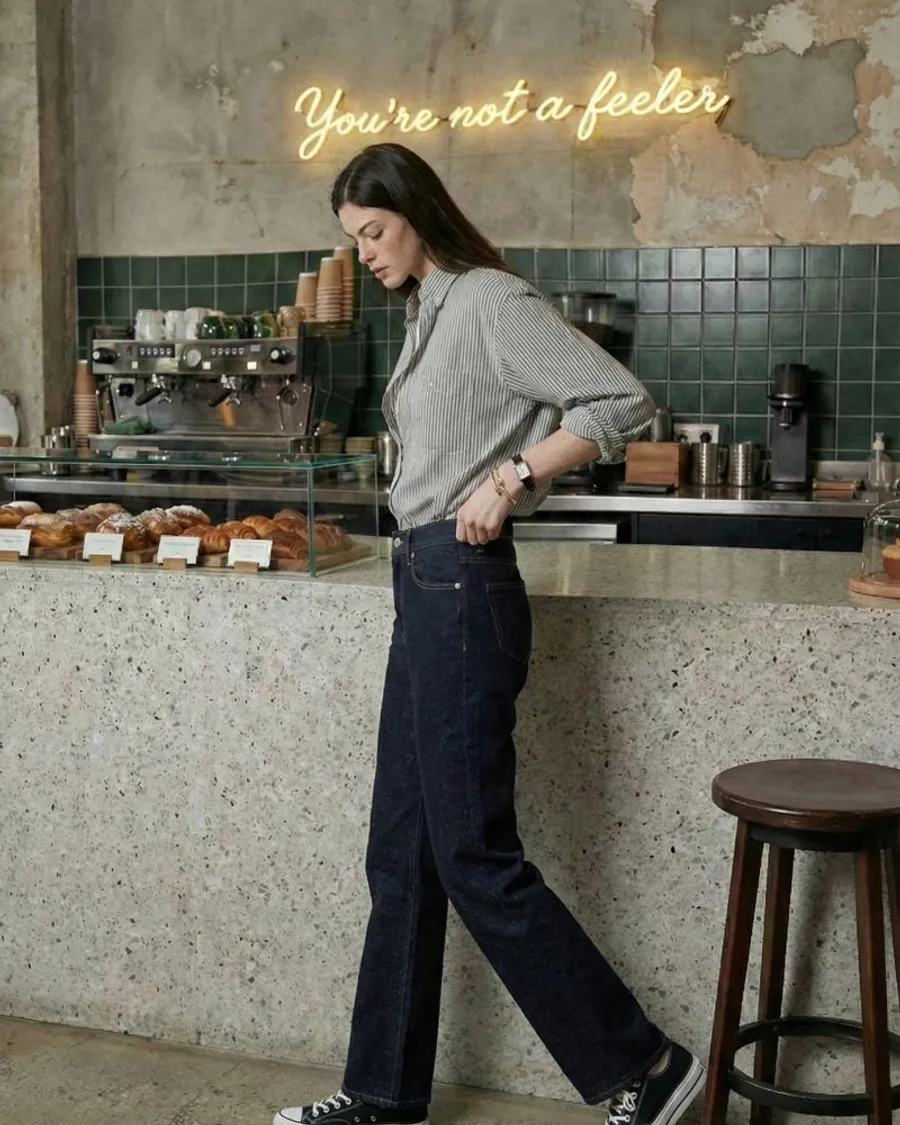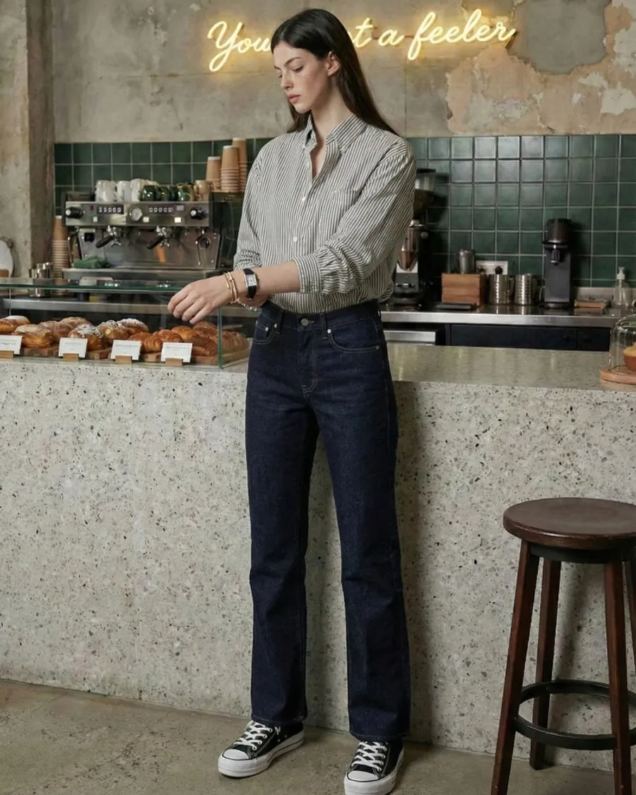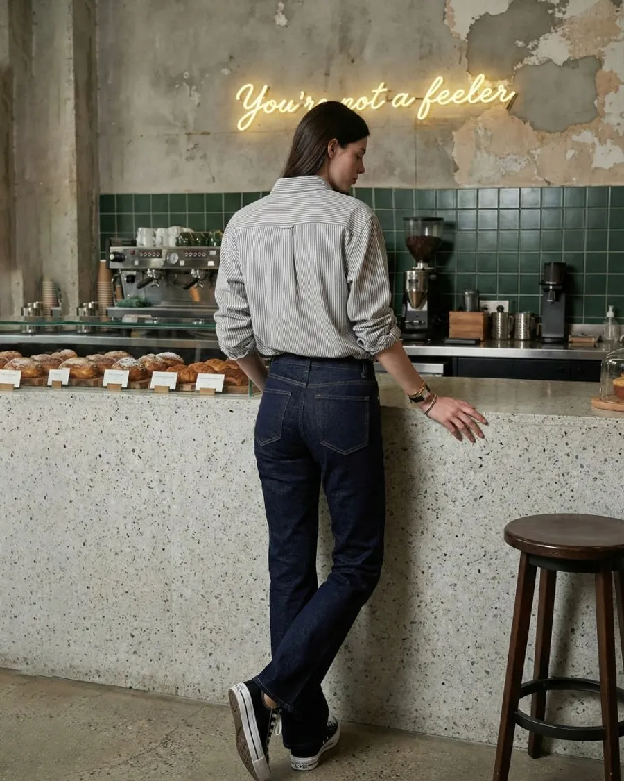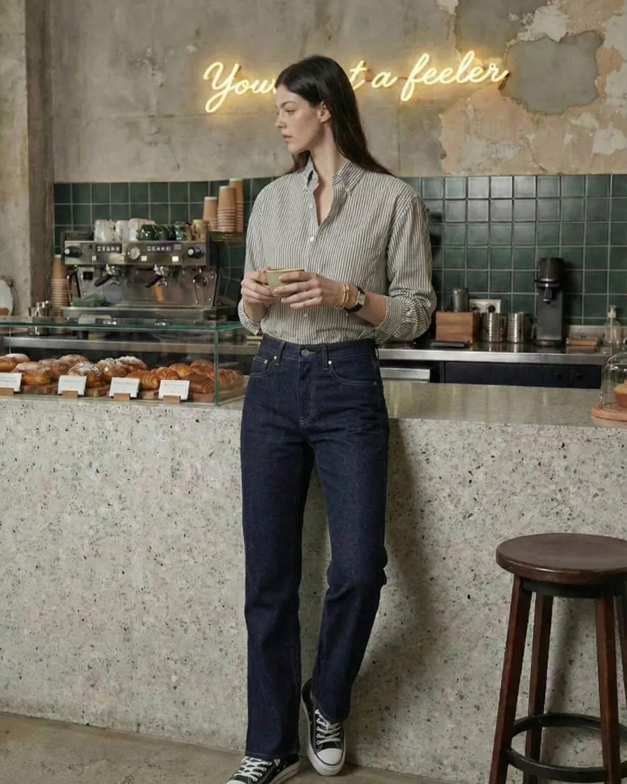 • 極簡造型:將白色襯衫塞進牛仔褲裡,以突顯原色牛仔褲的輪廓。