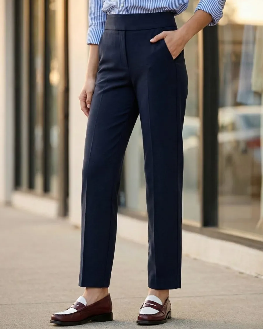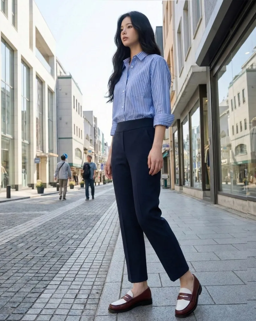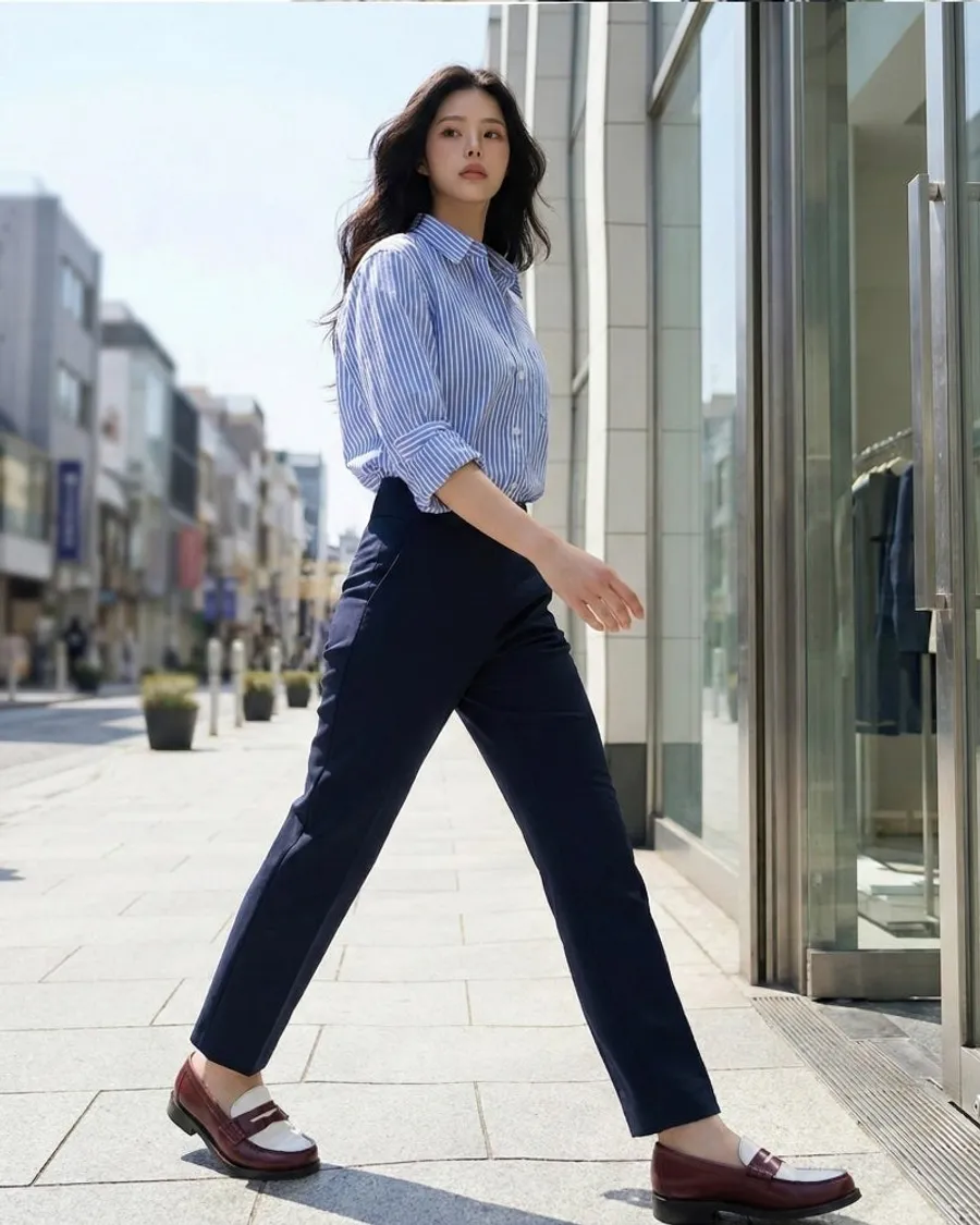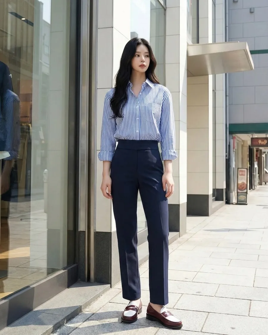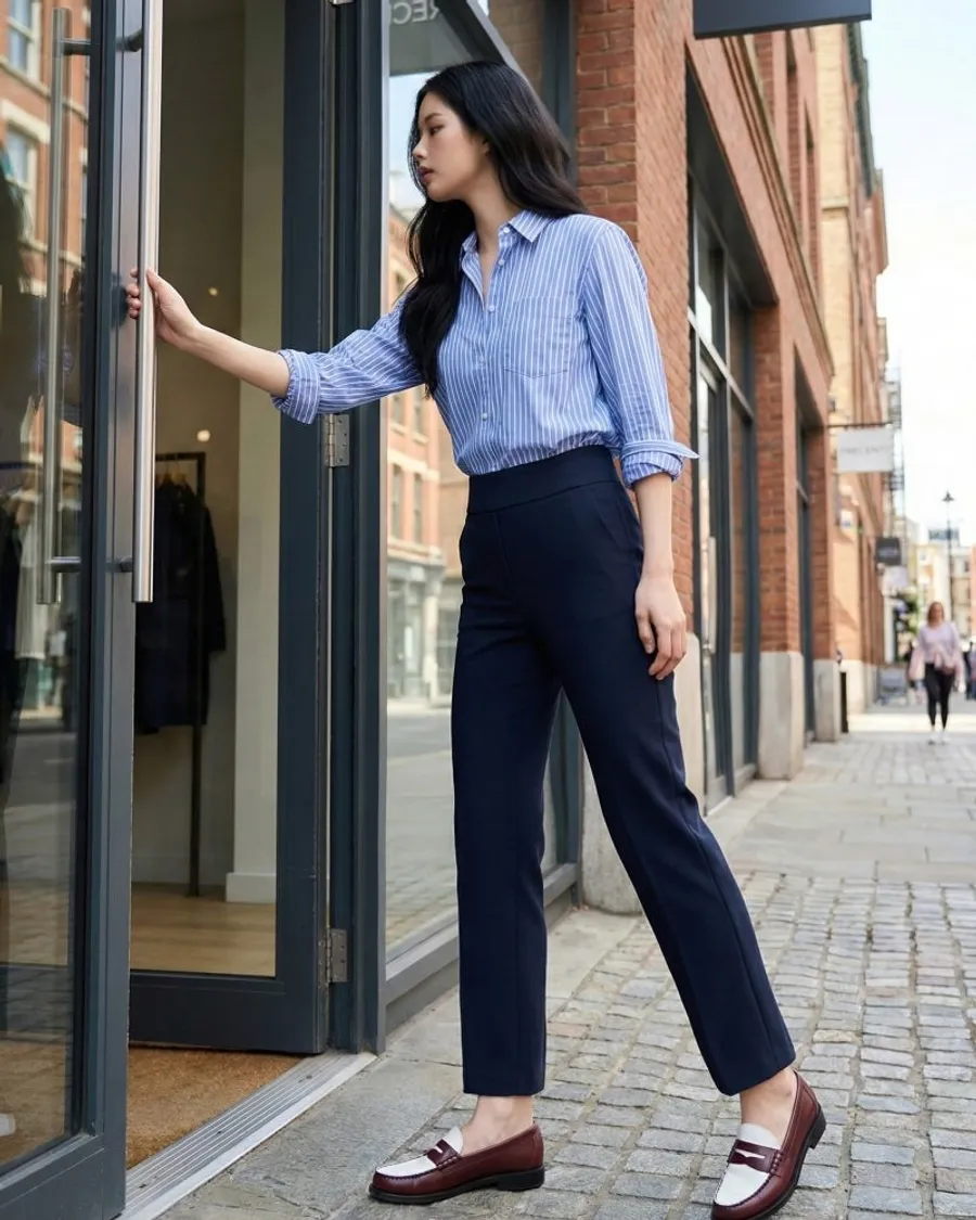 辦公室造型:搭配海軍藍長褲搭配整齊的條紋襯衫和樂福鞋,既能保持信任感,又保持活躍。