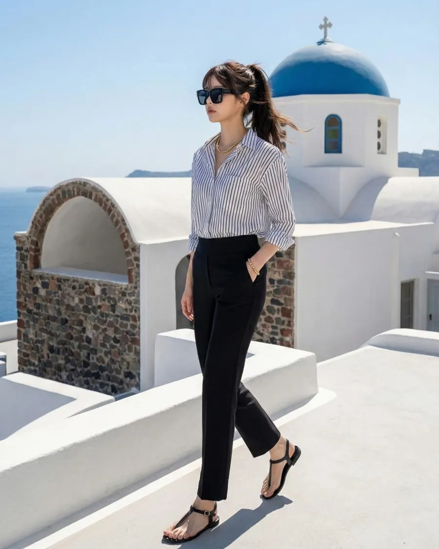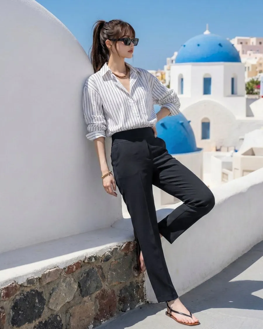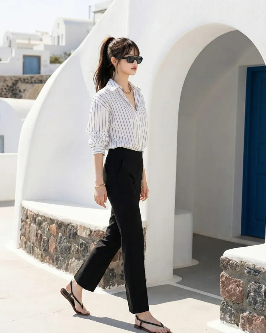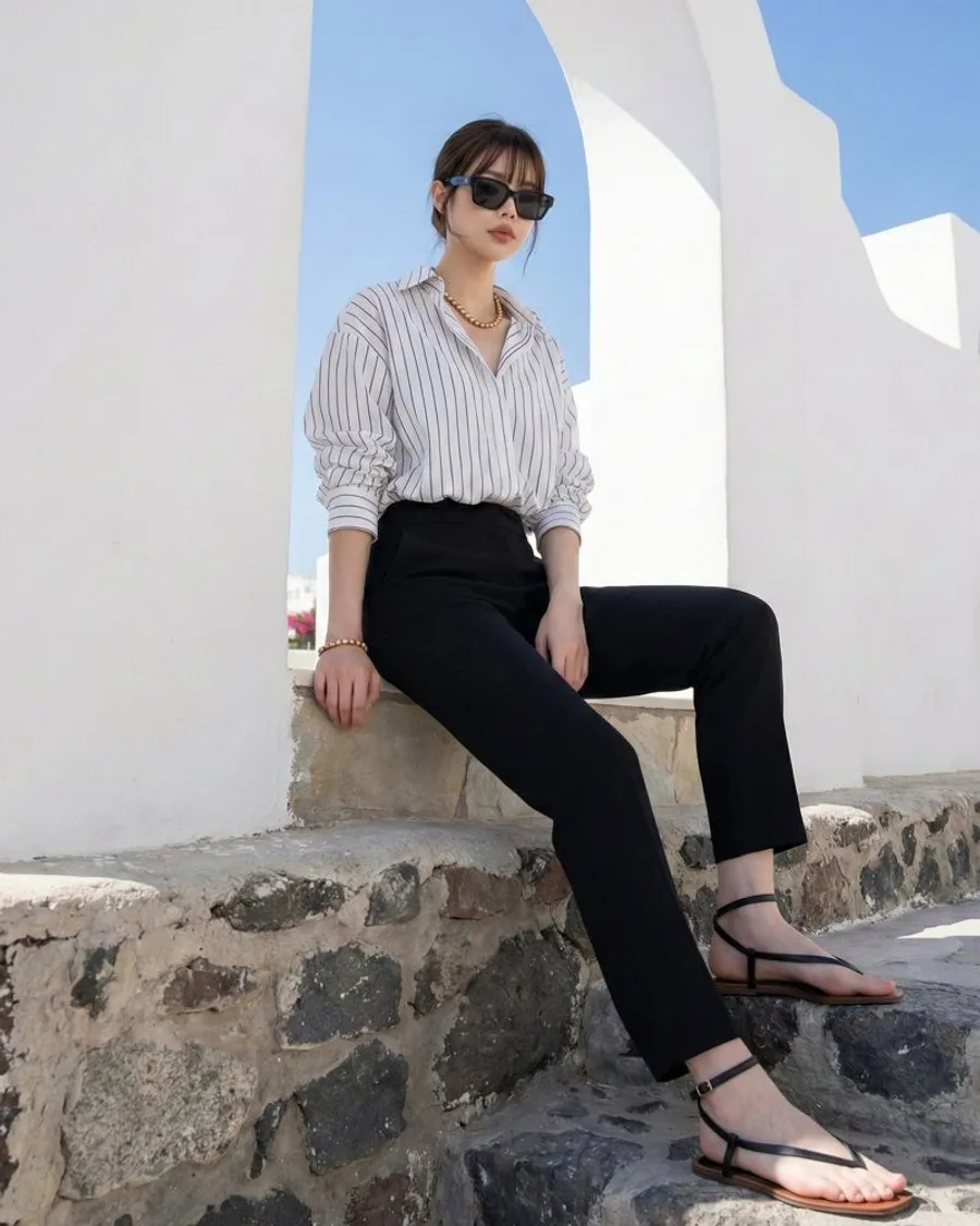 日常造型:搭配黑色長褲搭配合身襯衫或無袖造型,搭配太陽眼鏡和輕薄的人字拖來強調