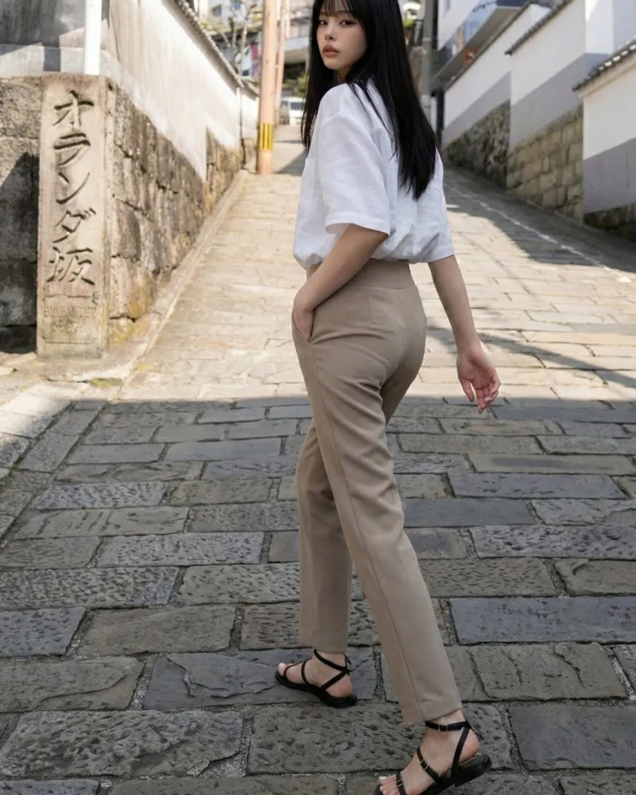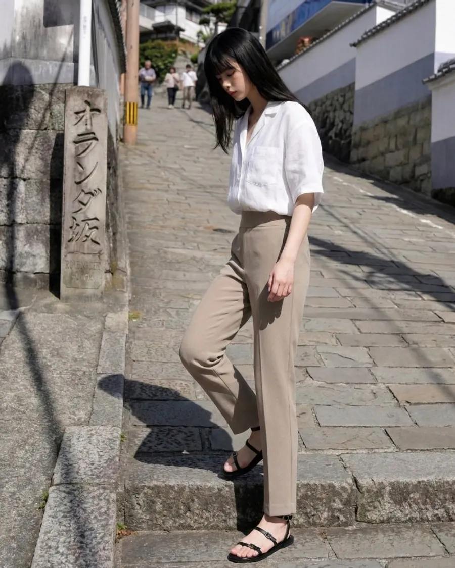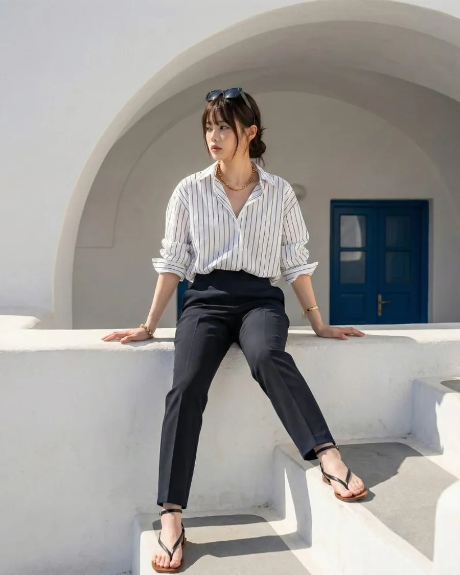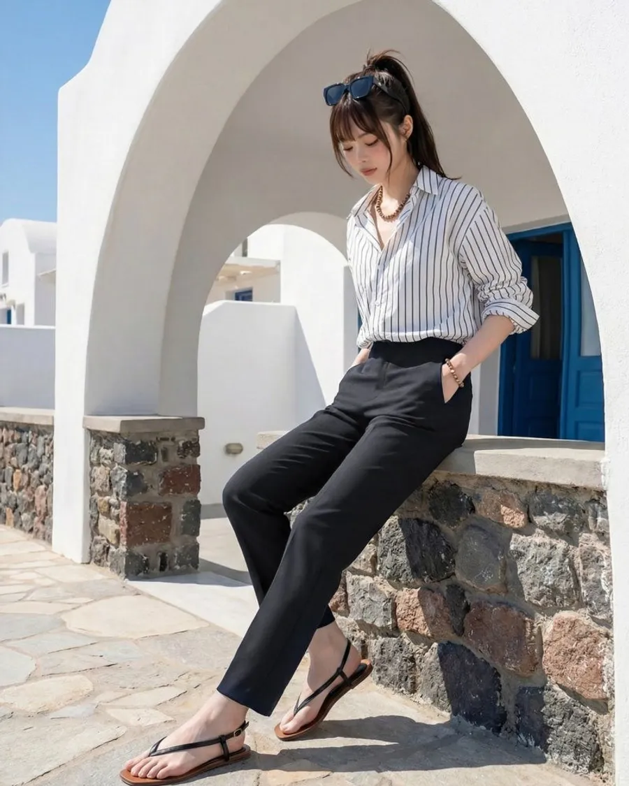 日常造型:搭配黑色長褲搭配合身襯衫或無袖造型,搭配太陽眼鏡和輕薄的人字拖來強調