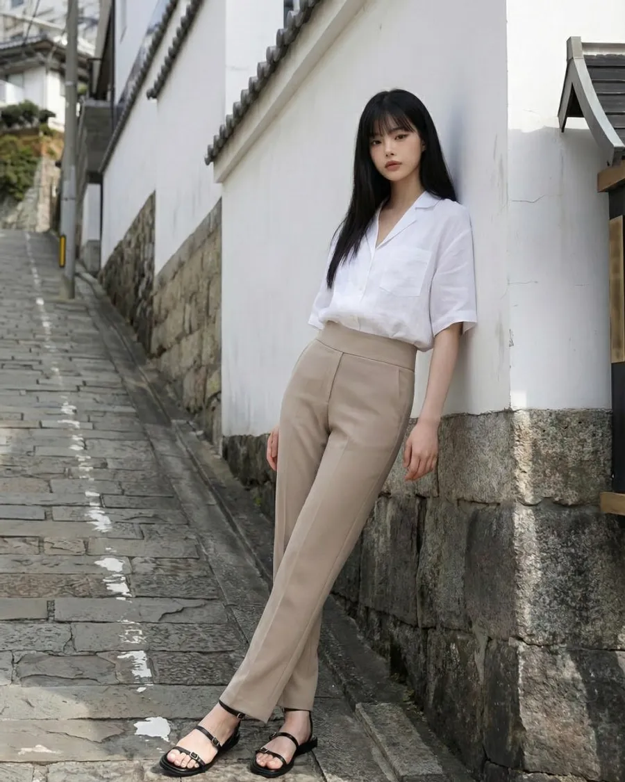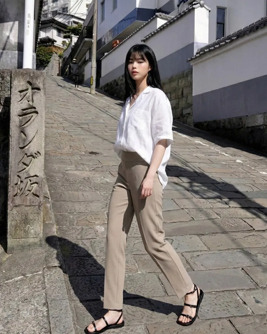 輕鬆造型:米色長褲搭配敞開的亞麻襯衫和細帶涼鞋,光看就展現出奢華度假/飲酒的感覺