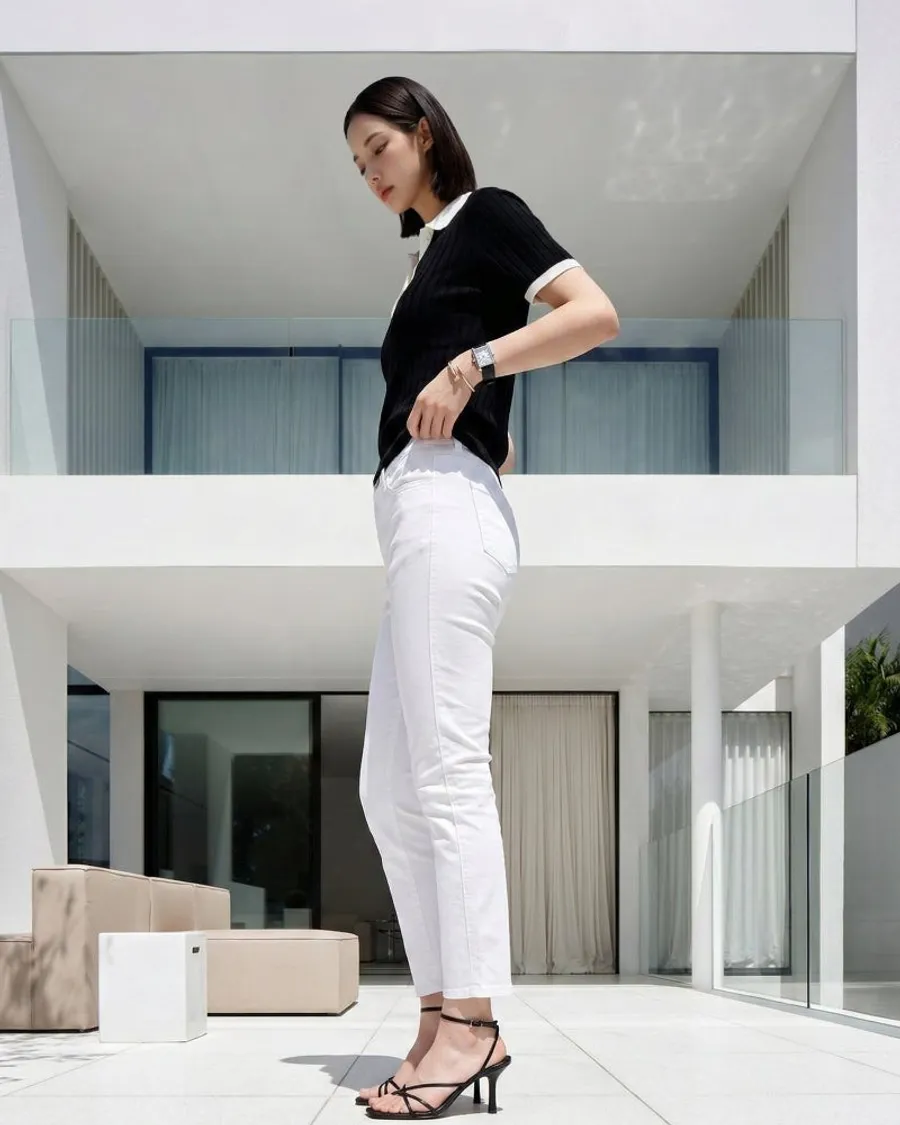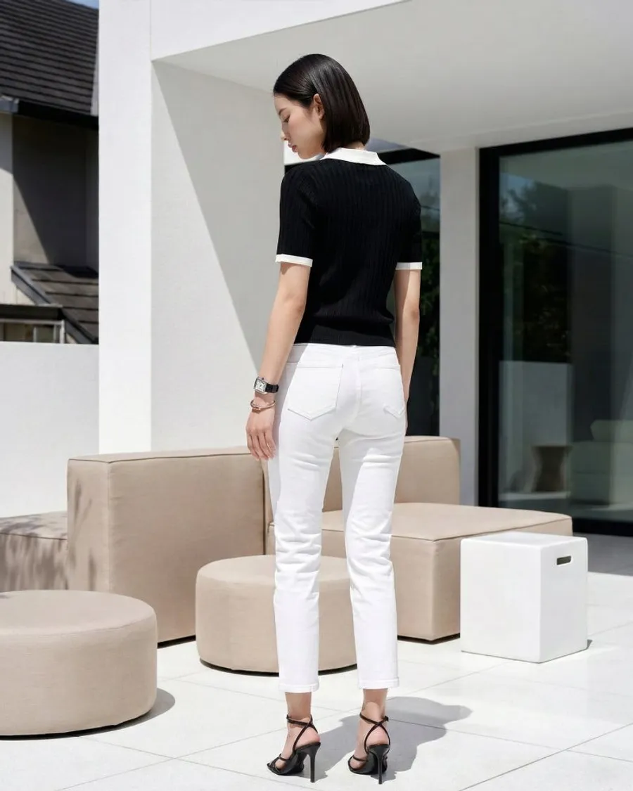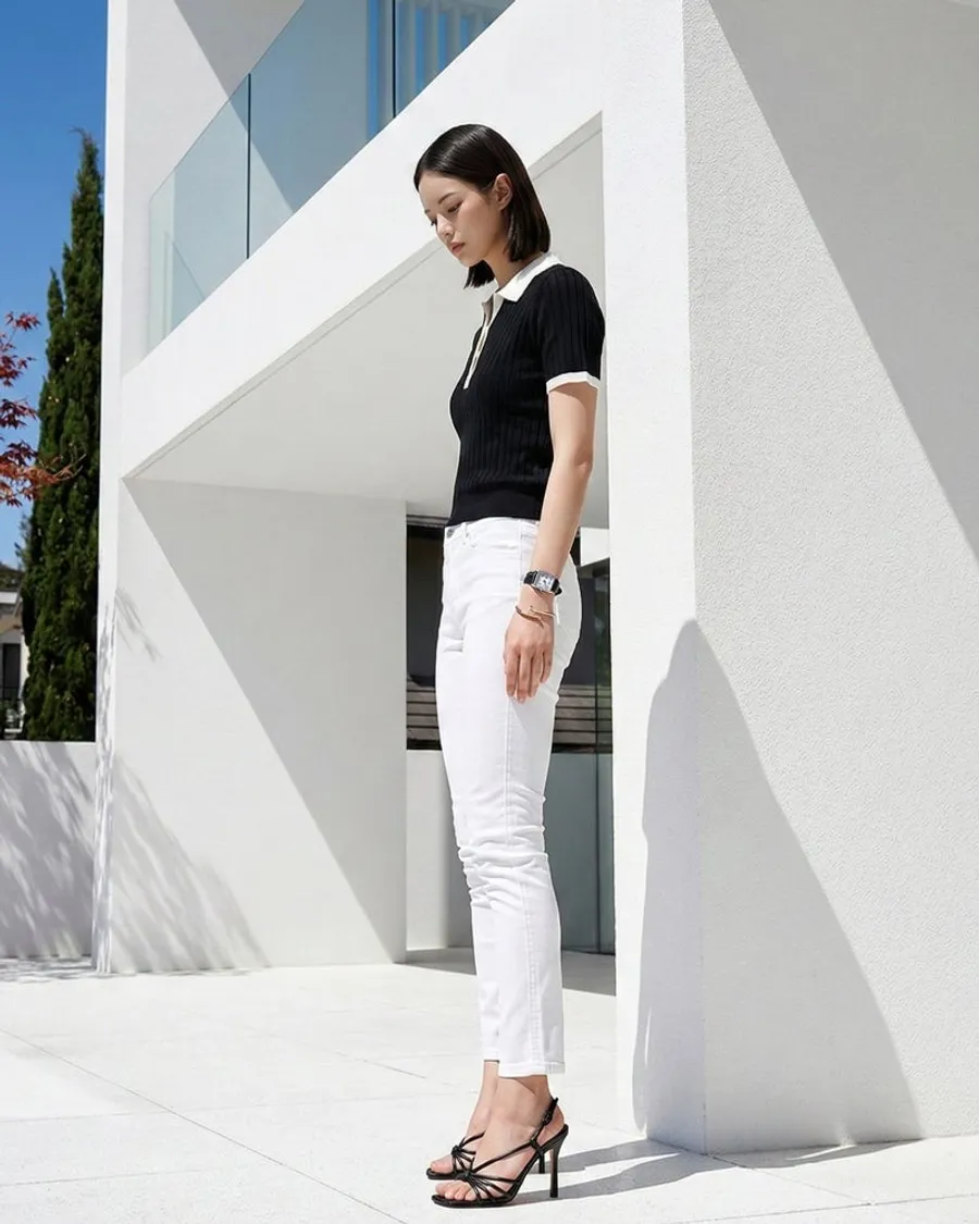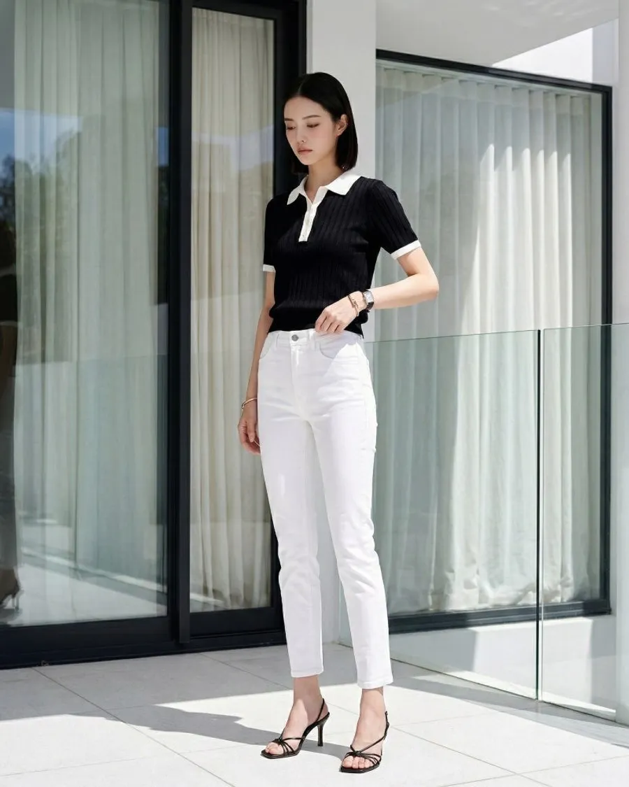 時尚極簡風格:(白色)搭配合身黑色有領針織布,造型乾淨且優雅,毫無花俏。