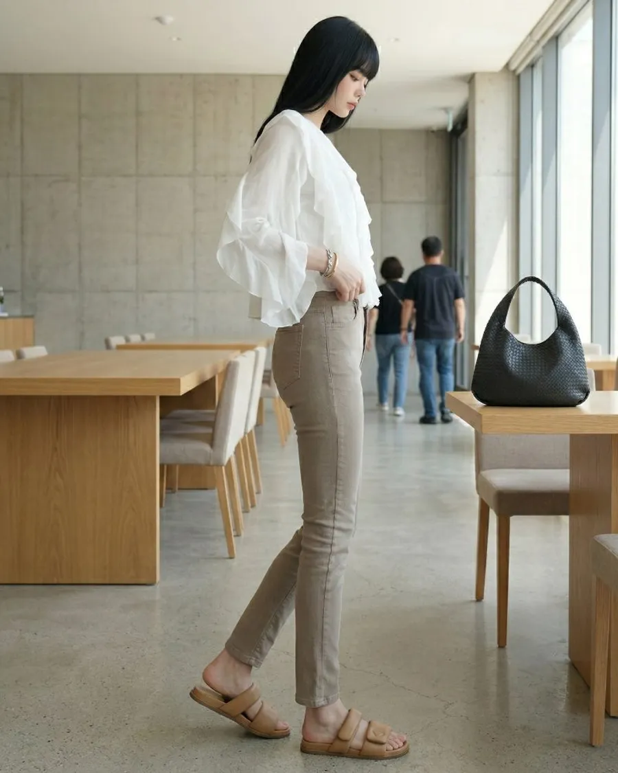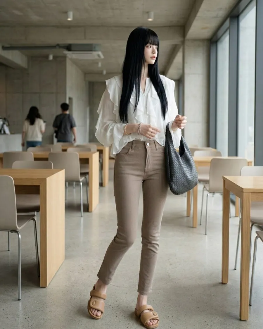 浪漫女性客服造型:搭配米色荷葉邊襯衫,修身下半身並增加上衣蓬鬆感,營造女性化妝容。