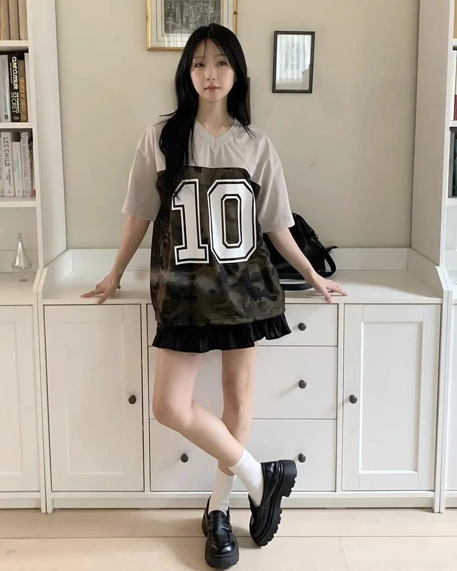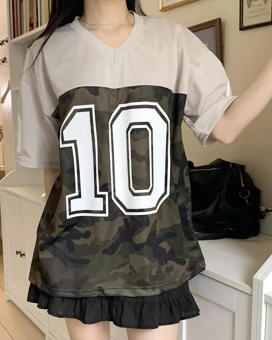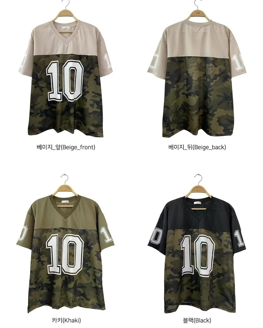 正韓 V領10拚色迷彩個性棉T恤