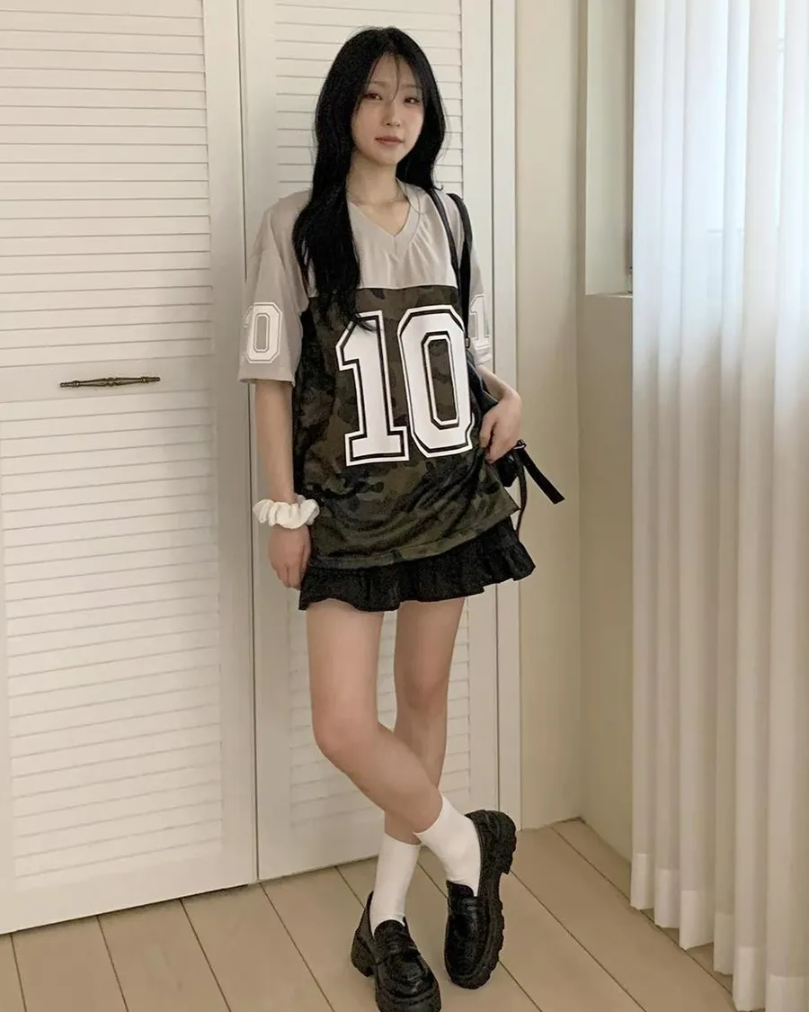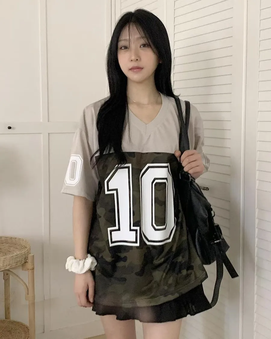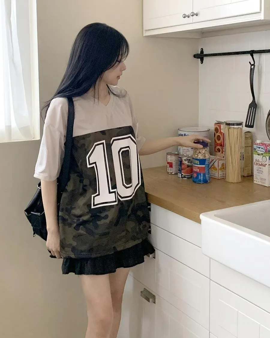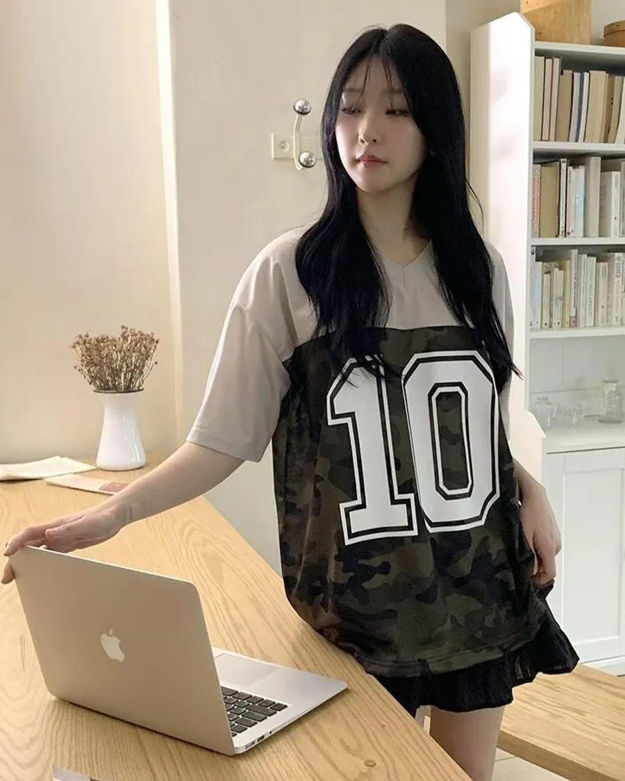 正韓 V領10拚色迷彩個性棉T恤
